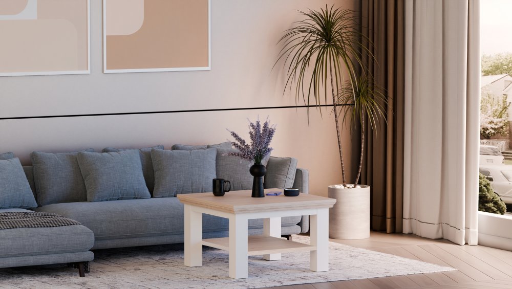 Stolik z kolekcji PONTYPOOL będzie doskonałym uzupełnieniem każdego salonu. Na kwadratowym blacie nie zabraknie miejsca na gorący napój, ciastko, słone przekąski i dekoracje, a dzięki znajdującej się pod nim półce zyskach dodatkowe miejsce na pilot do telewizora, książki, laptop lub inne rzeczy, których potrzebujesz w pobliżu podczas relaksu na sofie. Stolik doskonale wygląda zestawiona z pozostałymi elementami z kolekcji, tworząc wymarzoną aranżację salonu.