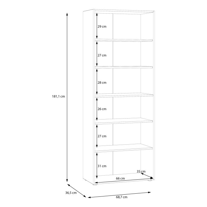 - Mebel ma wymiary 68,7 cm szerokości, 181,1 cm wysokości oraz 36,5 cm głębokości
