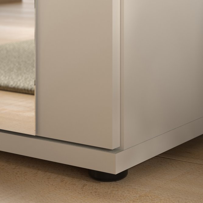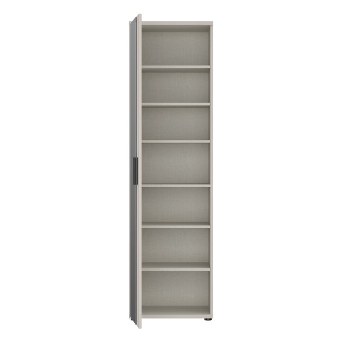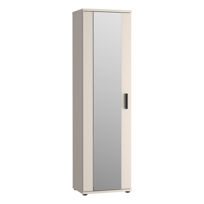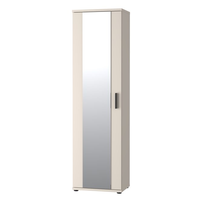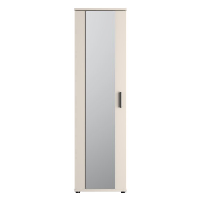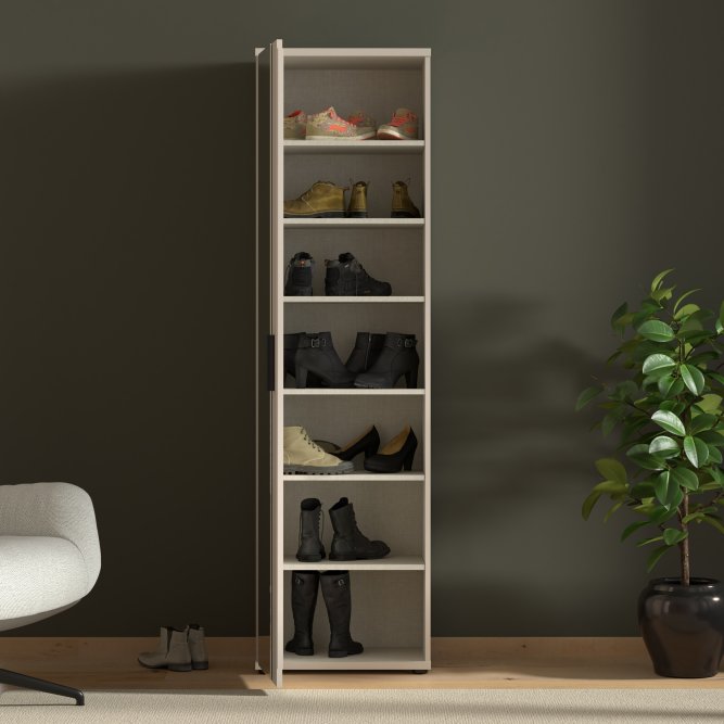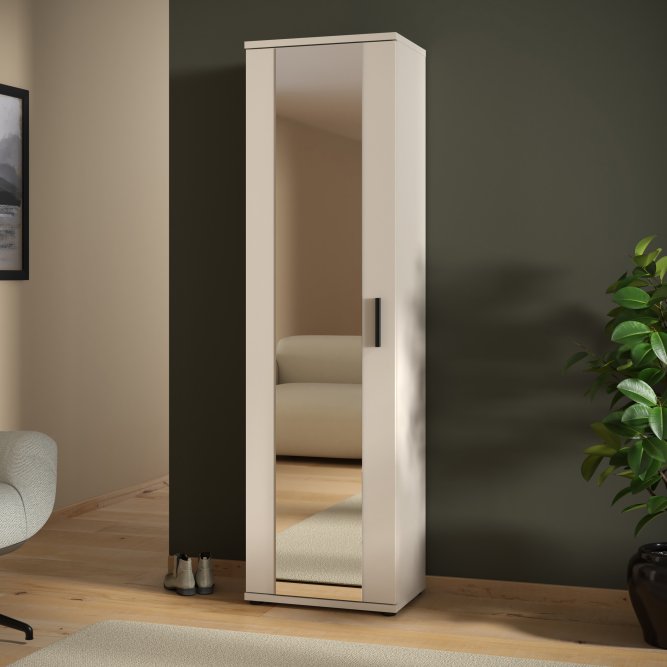 Szafa na buty to praktyczne rozwiązanie do wąskiego przedpokoju — wysoka, wąska bryła z drzwiami uchylnymi i lustrem zajmuje niewiele miejsca, a jednocześnie oferuje dużą pojemność. Wewnątrz znajduje się 6 półek, które pomieszczą do około 14 par obuwia i pozwalają wygodnie segregować buty według sezonu. Front w kolorze piaskowym oraz minimalistyczny, czarny uchwyt z tworzywa nadają meblowi neutralny, nowoczesny wygląd. Lustro na drzwiach ułatwia szybkie sprawdzenie wyglądu przed wyjściem.