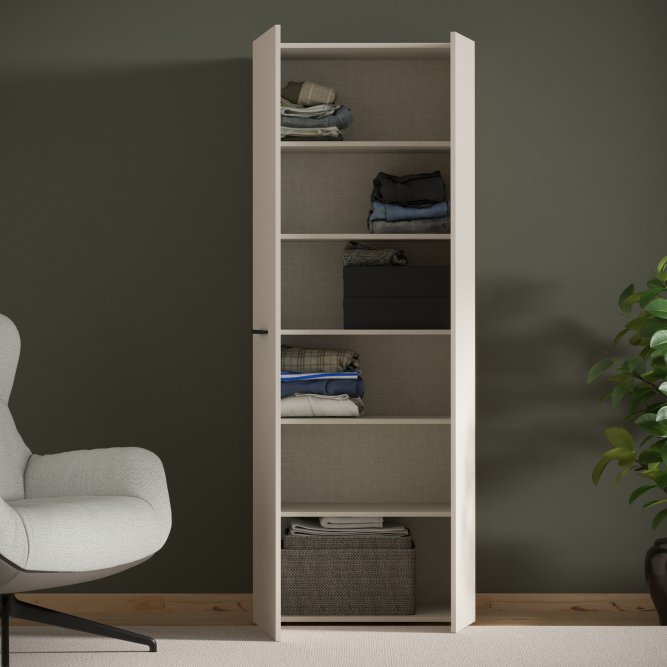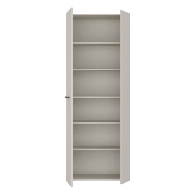 Nowoczesna, pojemna i minimalistyczna szafa na buty, która uporządkuje obuwie, nie dominując wnętrza. Dzięki smukłej, wysokiej bryle sprawdzi się w przedpokoju, korytarzu lub garderobie, oferując dużo miejsca na sezonowe i codzienne pary butów przy zachowaniu eleganckiego, stonowanego wyglądu. Szafa będzie idealna do wąskich przedpokojów i przestrzeni, gdzie potrzebna jest wysoka pojemność przechowywania przy zachowaniu dyskretnego, nowoczesnego charakteru.