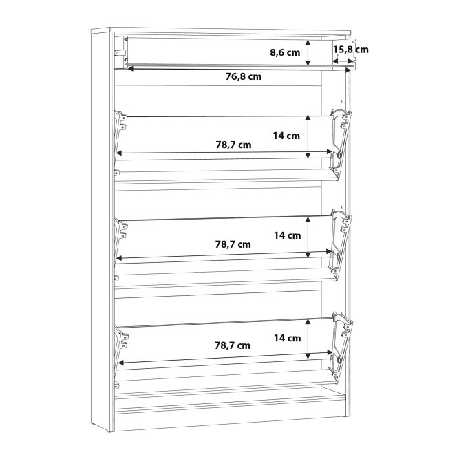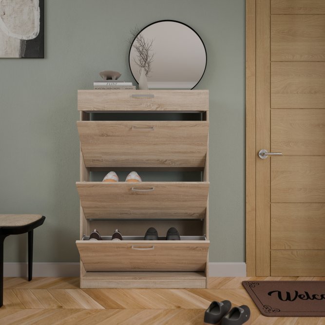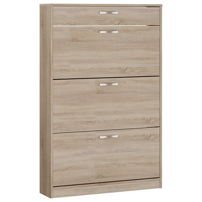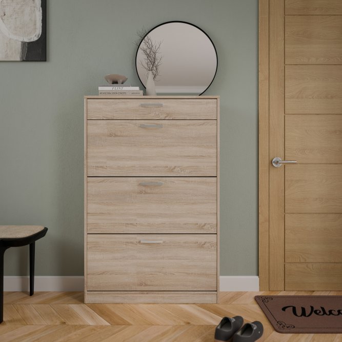 Szafa na buty w stylu nowoczesnym w dekorze Dąb Sonoma idealnie wpasuje się do każdego przedpokoju oraz garderoby. Dzięki niewielkim wymiarom nie zajmuje dużo przestrzeni, a mimo to jest w stanie pomieścić dużą ilość obuwia.