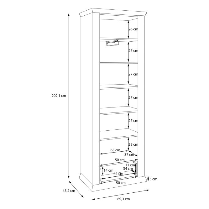 - Funkcjonalny mebel o wymiarach: szerokość 69.3 cm x wysokość 202.1 cm x głębokość 43.2 cm
