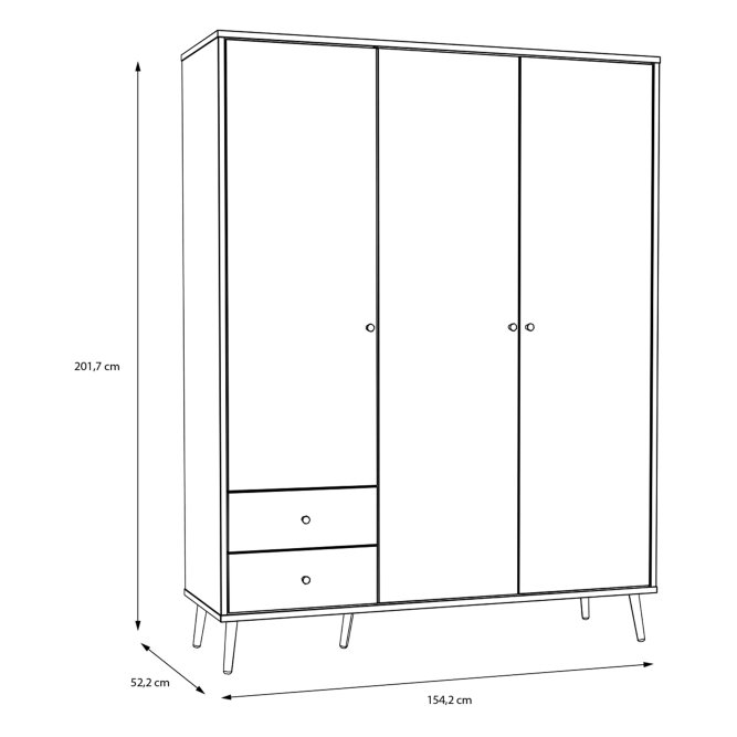 - Funkcjonalna szafa o wymiarach: szerokość 154,2 cm x wysokość 201,7 cm x głębokość 52,2 cm gwarantuje optymalną przestrzeń do przechowywania