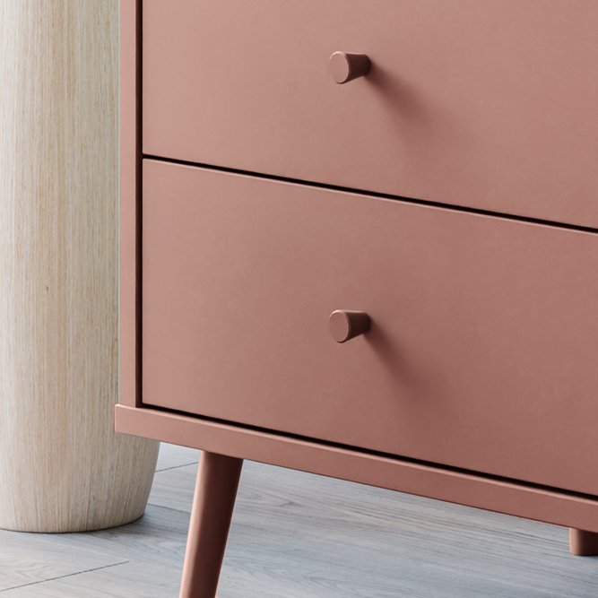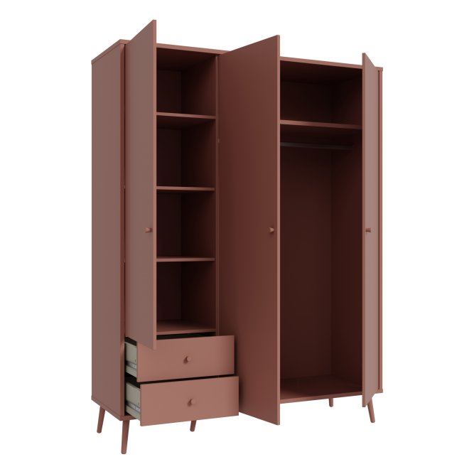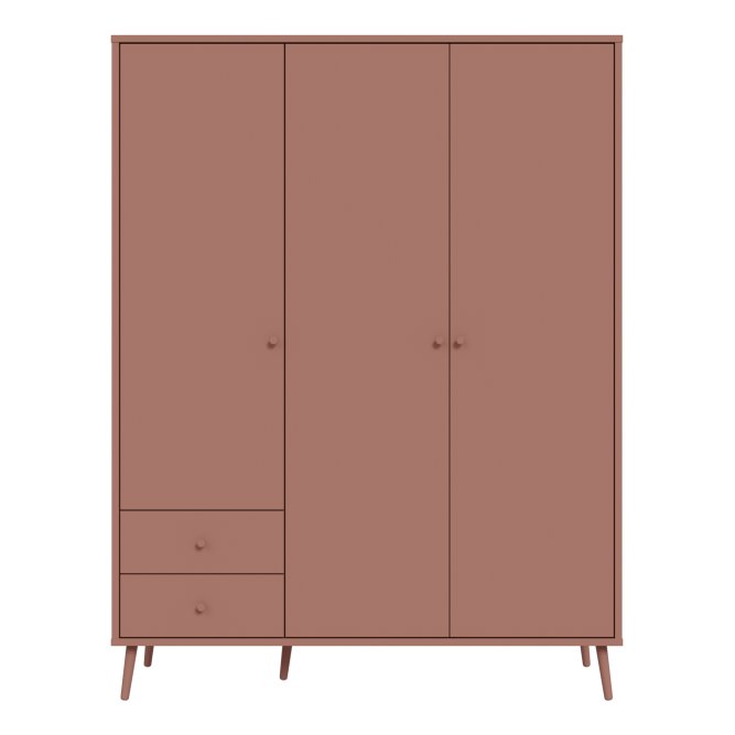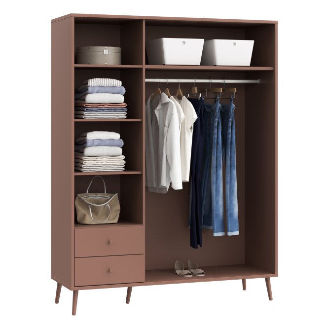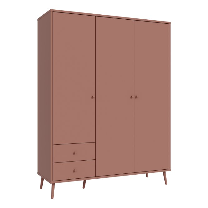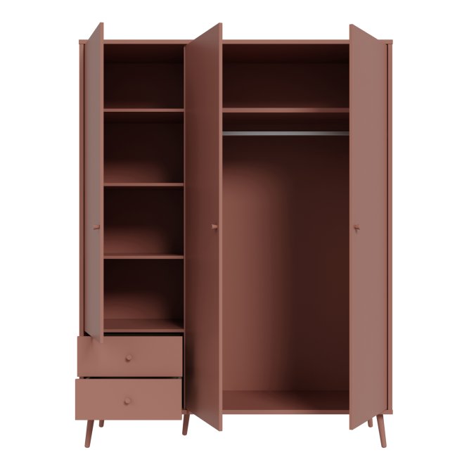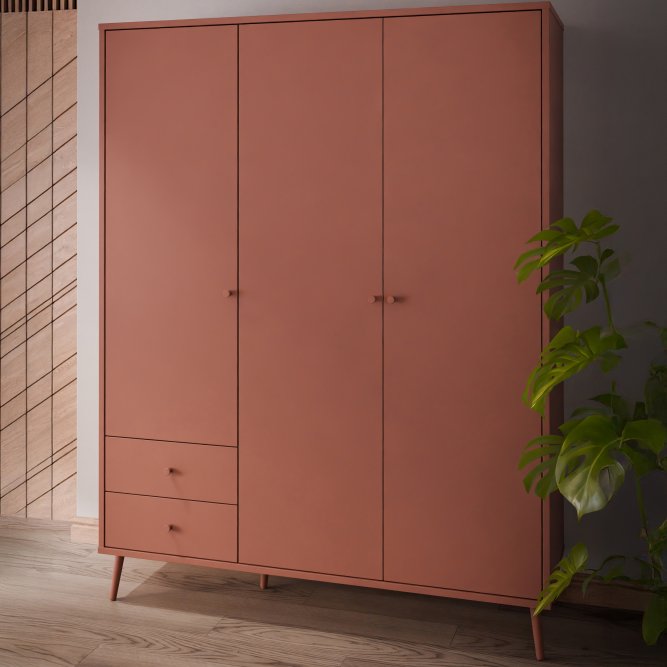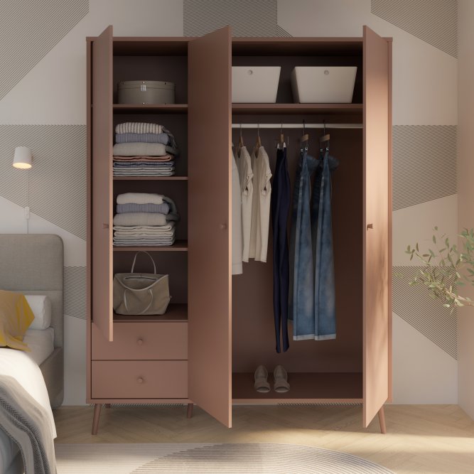 Kilka ważnych cech wyróżnia szafę HARLLSON spośród wielu innych mebli. Po pierwsze: sposób montażu. Składanie mebli jeszcze nigdy nie było tak szybkie i proste! Montaż może trwać nawet do 10 razy krócej niż w przypadku tradycyjnej metody składania, a dodatkowo nie wymaga używania prawie żadnych narzędzi, bo większość elementów łączy się ze sobą na “click”. Umożliwia to Easy Klix, innowacyjny system oparty na technologii Threespine ID®, który pozwala również na wielokrotny demontaż mebla i jego ponowne złożenie. W razie przeprowadzki nie musisz się martwić, że po rozłożeniu szafa się zniszczy. Przekonaj się jak prosty i przyjemny może być teraz montaż i demontaż mebla! Druga ważna cecha szafy, a także całej kolekcji HARLLSON Easy Klix by FORTE, to design - współczesny, ale jednocześnie przywołujący to, co najlepsze w stylu minionych epok. Subtelne w formie i kolorystyce meble łączą w sobie piękno i funkcjonalność. Wszystkie modele osadzono na drewnianych, wysokich, lekko skośnych nóżkach, dzięki temu nawet 3-drzwiowa szafa jest wizualnie lekka i nie przytłoczy pomieszczenia. Delikatne drewniane uchwyty w formie gałek podkreślają styl kolekcji i są idealnie dopasowane do poszczególnych opcji kolorystycznych. Meble będą wspaniałą bazą do aranżacji wygodnego pokoju dziennego oraz sypialni w duchu skandynawskim, scandi boho czy retro. Szafa HARLLSON, w efektownym dekorze terakoty z powodzeniem sprawdzi się w Twojej sypialni. Posiada dobrze zorganizowane wnętrze, w którym łatwo utrzymać porządek: 2 szuflady na drobne ubrania lub bieliznę, drążek ubraniowy oraz 4 półki. Dzięki systemowi cichego domyku, drzwiczki zamykają oraz otwierają się delikatnie i bezgłośnie.