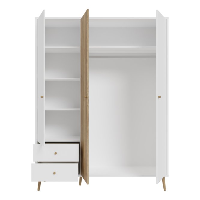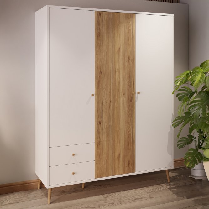 Kilka ważnych cech wyróżnia szafę HARLLSON spośród wielu innych mebli. Po pierwsze: sposób montażu. Składanie mebli jeszcze nigdy nie było tak szybkie i proste! Montaż może trwać nawet do 10 razy krócej niż w przypadku tradycyjnej metody składania, a dodatkowo nie wymaga używania prawie żadnych narzędzi, bo większość elementów łączy się ze sobą na “click”. Umożliwia to Easy Klix, innowacyjny system oparty na technologii Threespine ID®, który pozwala również na wielokrotny demontaż mebla i jego ponowne złożenie. W razie przeprowadzki nie musisz się martwić, że po rozłożeniu szafa się zniszczy. Przekonaj się jak prosty i przyjemny może być teraz montaż i demontaż mebla! Druga ważna cecha szafy, a także całej kolekcji HARLLSON Easy Klix by FORTE, to design - współczesny, ale jednocześnie przywołujący to, co najlepsze w stylu minionych epok. Subtelne w formie i kolorystyce meble łączą w sobie piękno i funkcjonalność. Wszystkie modele osadzono na drewnianych, wysokich, lekko skośnych nóżkach, dzięki temu nawet 3-drzwiowa szafa jest wizualnie lekka i nie przytłoczy pomieszczenia. Delikatne drewniane uchwyty w formie gałek podkreślają styl kolekcji i są idealnie dopasowane do poszczególnych opcji kolorystycznych. Meble będą wspaniałą bazą do aranżacji wygodnego pokoju dziennego oraz sypialni w duchu skandynawskim, scandi boho czy retro. Szafa HARLLSON, w efektownym połączeniu dekorów białego i Dąb Mauvella, z powodzeniem sprawdzi się w Twojej sypialni. Posiada dobrze zorganizowane wnętrze, w którym łatwo utrzymać porządek: 2 szuflady na drobne ubrania lub bieliznę, drążek ubraniowy oraz 4 półki. Dzięki systemowi cichego domyku, drzwiczki zamykają oraz otwierają się delikatnie i bezgłośnie.