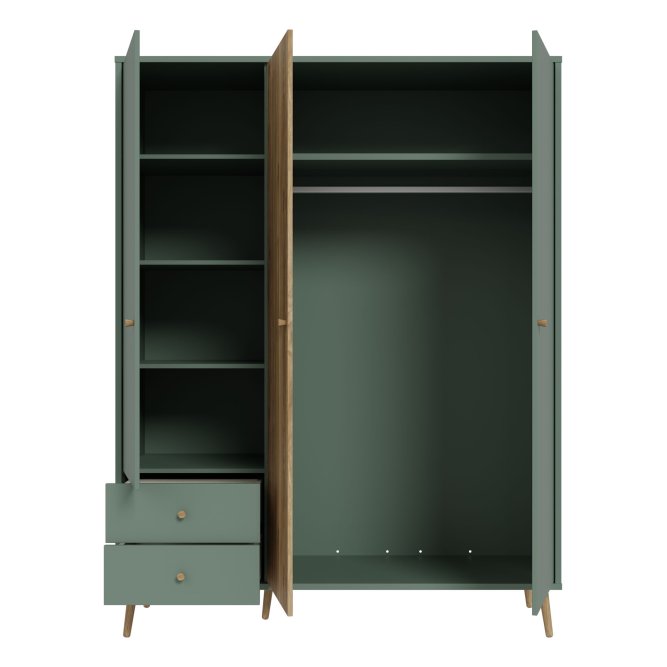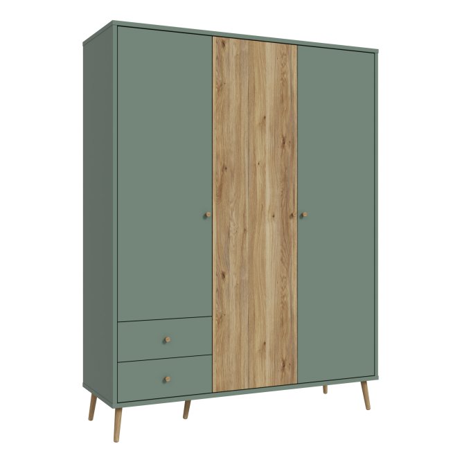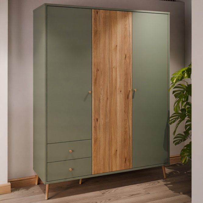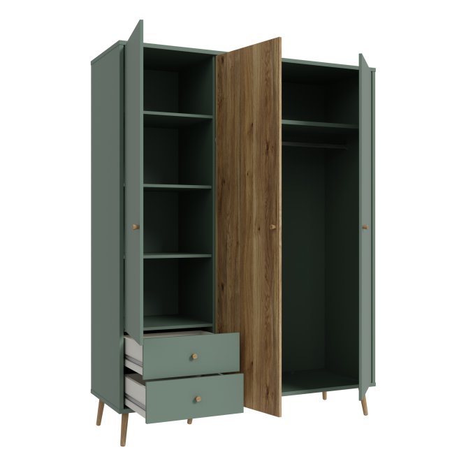 Kilka ważnych cech wyróżnia szafę HARLLSON spośród wielu innych mebli. Po pierwsze: sposób montażu. Składanie mebli jeszcze nigdy nie było tak szybkie i proste! Montaż może trwać nawet do 10 razy krócej niż w przypadku tradycyjnej metody składania, a dodatkowo nie wymaga używania prawie żadnych narzędzi, bo większość elementów łączy się ze sobą na “click”. Umożliwia to Easy Klix, innowacyjny system oparty na technologii Threespine ID®, który pozwala również na wielokrotny demontaż mebla i jego ponowne złożenie. W razie przeprowadzki nie musisz się martwić, że po rozłożeniu szafa się zniszczy. Przekonaj się jak prosty i przyjemny może być teraz montaż i demontaż mebla! Druga ważna cecha szafy, a także całej kolekcji HARLLSON Easy Klix by FORTE, to design - współczesny, ale jednocześnie przywołujący to, co najlepsze w stylu minionych epok. Subtelne w formie i kolorystyce meble łączą w sobie piękno i funkcjonalność. Wszystkie modele osadzono na drewnianych, wysokich, lekko skośnych nóżkach, dzięki temu nawet 3-drzwiowa szafa jest wizualnie lekka i nie przytłoczy pomieszczenia. Delikatne drewniane uchwyty w formie gałek podkreślają styl kolekcji i są idealnie dopasowane do poszczególnych opcji kolorystycznych. Meble będą wspaniałą bazą do aranżacji wygodnego pokoju dziennego oraz sypialni w duchu skandynawskim, scandi boho czy retro. Szafa HARLLSON, w efektownym połączeniu dekorów szałwiowego i Dąb Mauvella, z powodzeniem sprawdzi się w Twojej sypialni. Posiada dobrze zorganizowane wnętrze, w którym łatwo utrzymać porządek: 2 szuflady na drobne ubrania lub bieliznę, drążek ubraniowy oraz 4 półki. Dzięki systemowi cichego domyku, drzwiczki zamykają oraz otwierają się delikatnie i bezgłośnie.