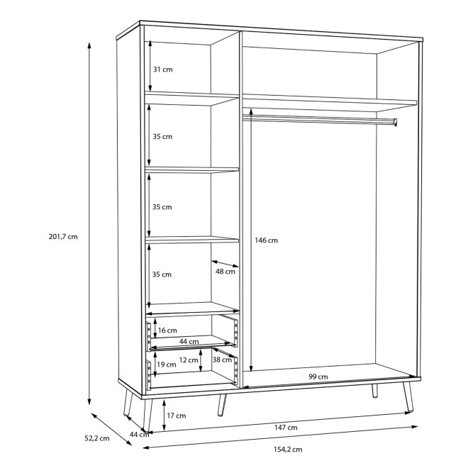 - Wymiary: szerokość 154,2 cm, wysokość 201,7 cm, głębokość 52,2 cm