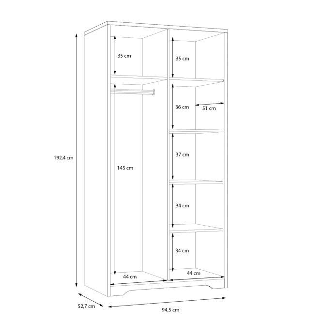- Wymiary: szerokość 94,5 cm x wysokość 192,4 cm x głębokość 52,7 cm