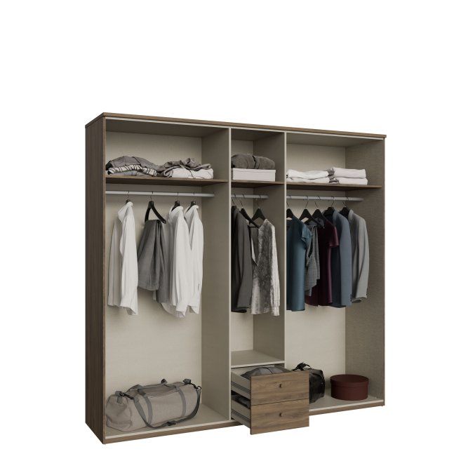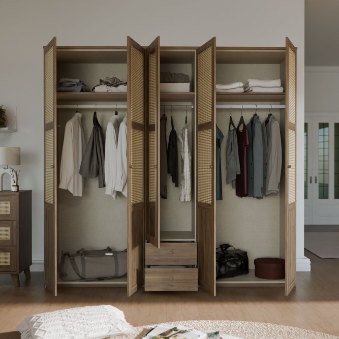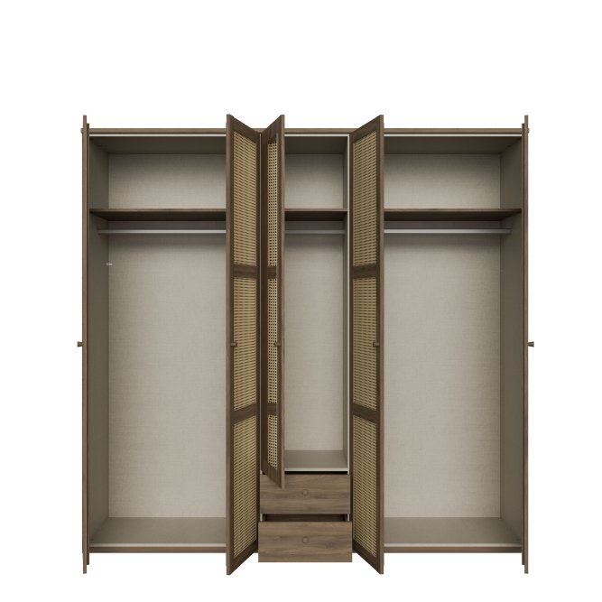Szafa GLENKEEN to sposób na maksymalne wykorzystanie dostępnej przestrzeni. Wydzielono w niej 3 strefy - 2 szerokie przestrzenie z drążkiem na wieszaki i półką oraz jedną wąską przestrzeń z drążkiem, półką i szufladami. Potrzebujesz półek? Mamy półki do wszystkich 3 stref - możesz zaprojektować wnętrze szafy po swojemu. Tym, co wyróżnia mebel jest plecionka wiedeńska, którą wykorzystano na frontach, przez co doskonale wpisuje się w styl boho lub japandi. Połącz szafę z innymi meblami z tej kolekcji, aby stworzyć przytulną i spójną aranżację.