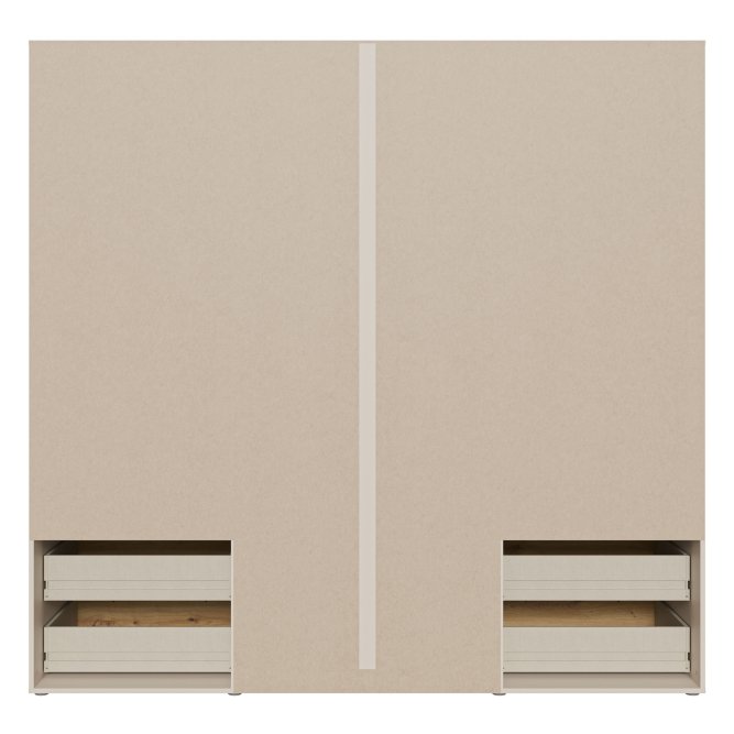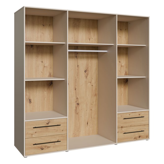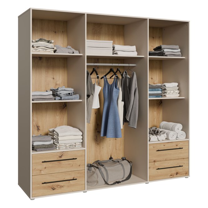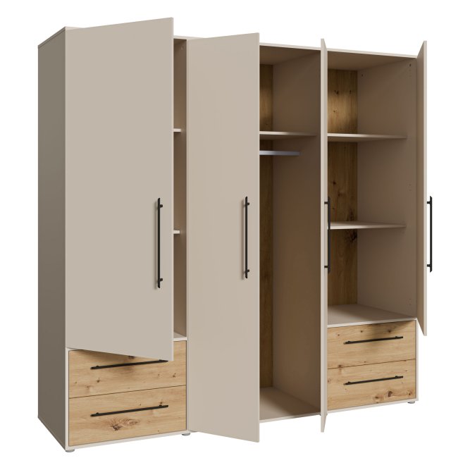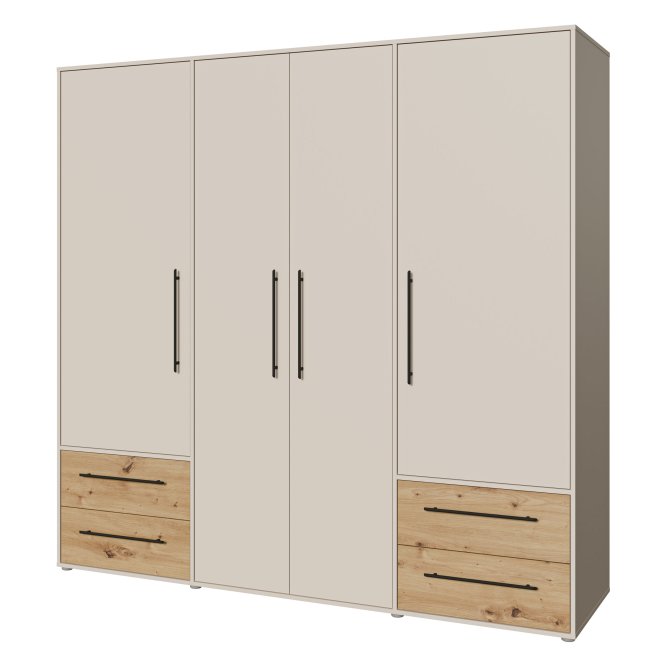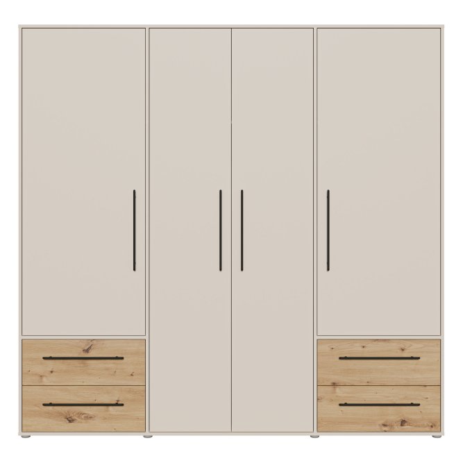 Duża, 4-drzwiowa szafa o szerokości nieco ponad 205 cm doskonale sprawdzi się we wnętrzach urządzonych w stylu nowoczesnym, w szczególności w takich pomieszczeniach, jak sypialnia i przedpokój. Ma dobrze zorganizowaną przestrzeń: 4 szuflady, drążek ubraniowy i 7 półek. Dzięki takiemu układowi, w szafie możesz przechowywać różnorodne rzeczy - nie tylko odzież, lecz także sprzęt sportowy i hobbistyczny, dokumenty czy zdjęcia.