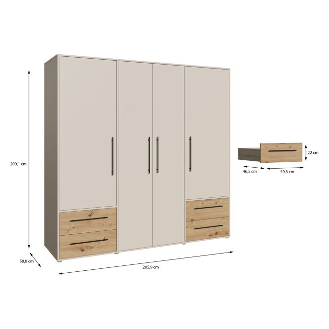 - Funkcjonalna szafa o wymiarach: szerokość 205,9 cm x wysokość 200,1 cm x głębokość 58,8 cm gwarantuje optymalną przestrzeń do przechowywania