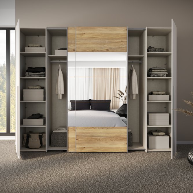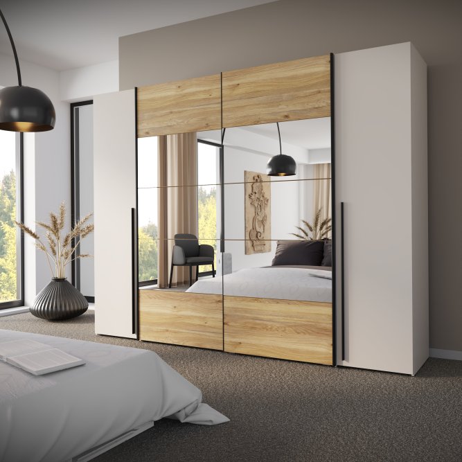 Szafa ubraniowa w stylu MODERN będzie pięknie prezentować się w takich pomieszczeniach jak Sypialnia. 4-drzwiowa Szafa ubraniowa zapewnia odpowiednio dużo miejsca do przechowywania.
