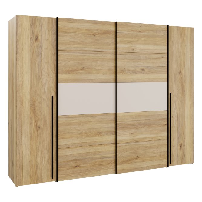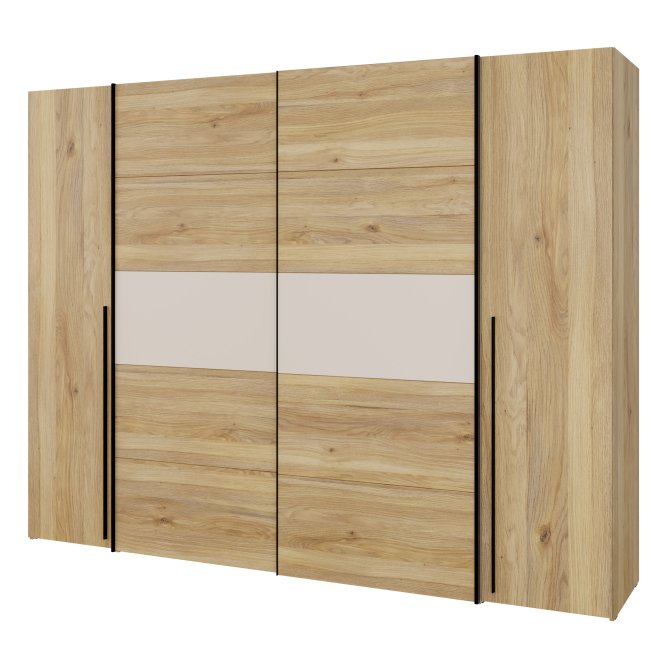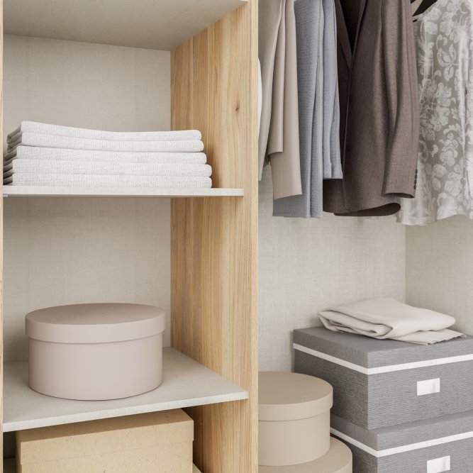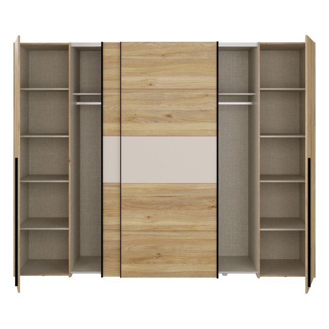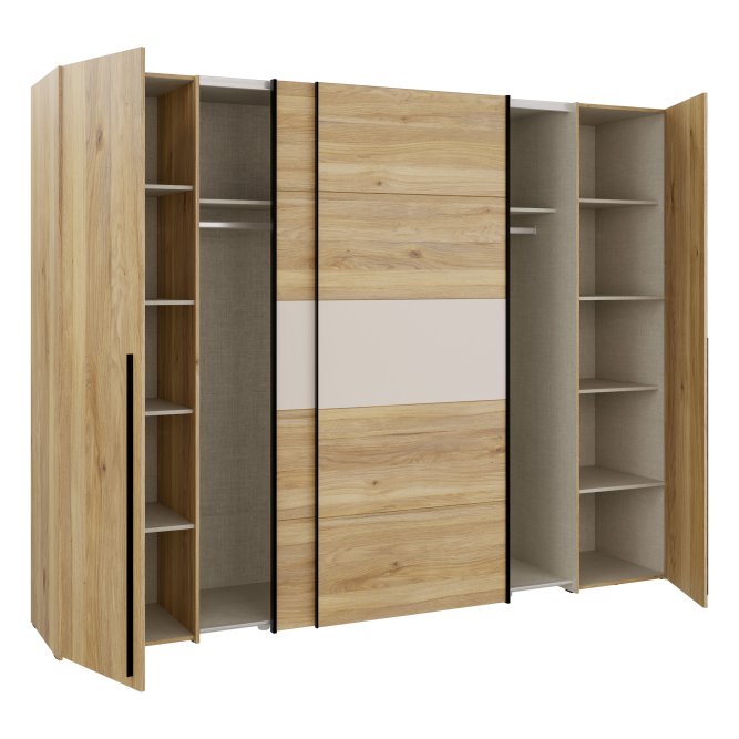 Szafa BELLEVUE to nieodłączny element aranżacji sypialni oraz garderoby w skandynawskim lub boho stylu. Szafę podzielono na 4 przestrzenie - 2 środkowe zawierają drążek na wieszaki i półkę, dwie skrajne wyposażono w 4 półki. Dzięki temu każda część garderoby znajdzie swoje miejsce.