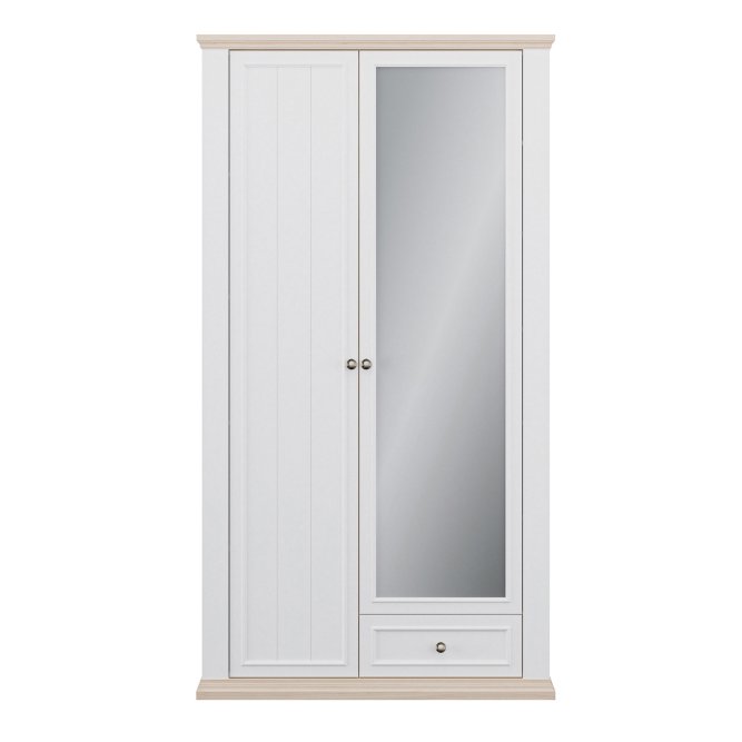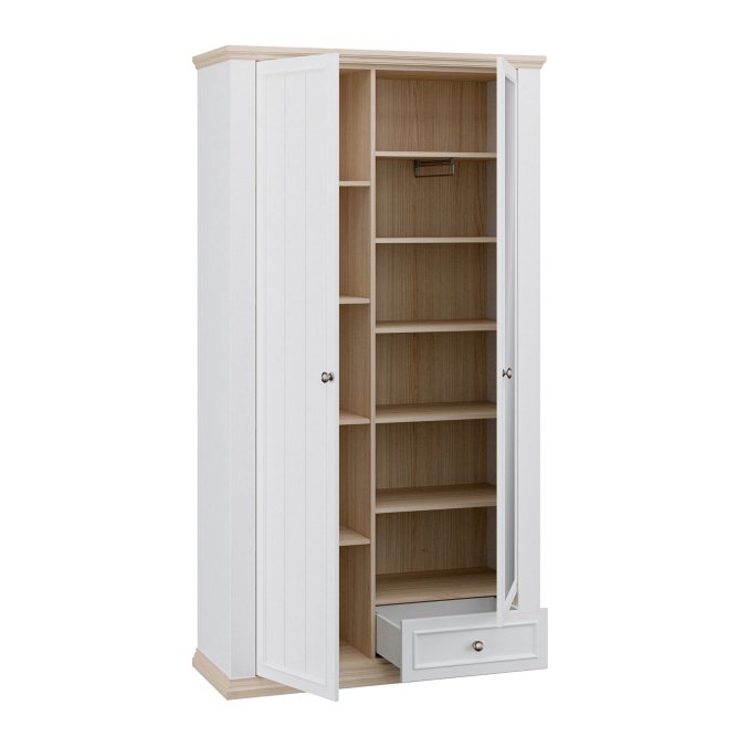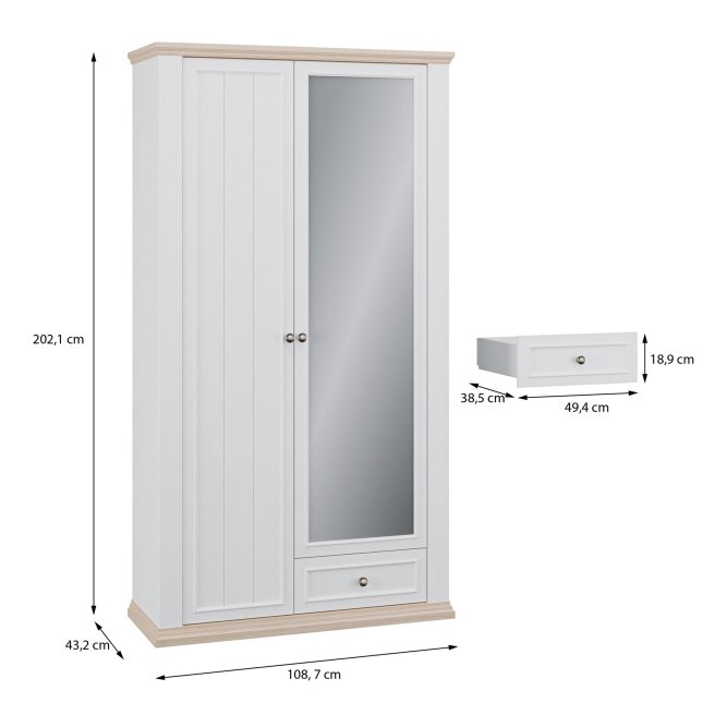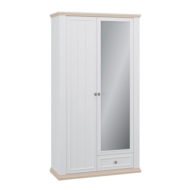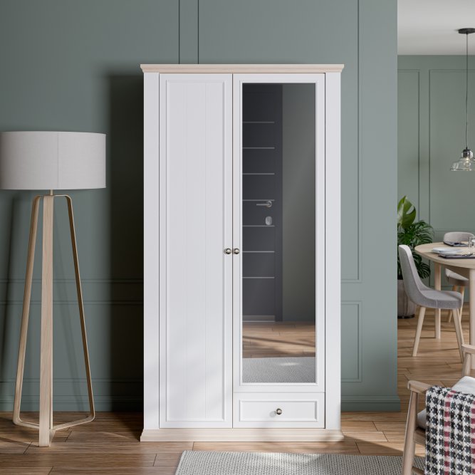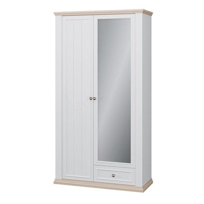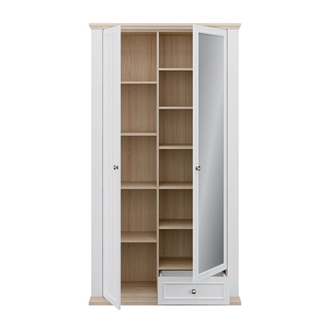 Szafa ubraniowa z kolekcji PONTYPOOL w stylu prowansalskim będzie pięknie prezentować się w takich pomieszczeniach jak salon, sypialnia czy korytarz. W jej wnętrzu kryje się 11 pojemnych półek, a dodatkowe miejsce na drobiazgi zapewni szuflady. Lustro na froncie szafy jest proktycznym dodatkiem, który dodatkowo optycznie powiększa przestrzeń.