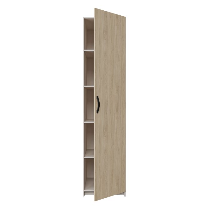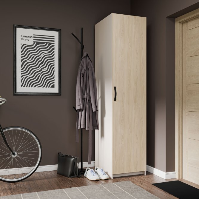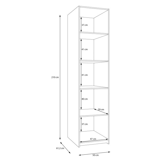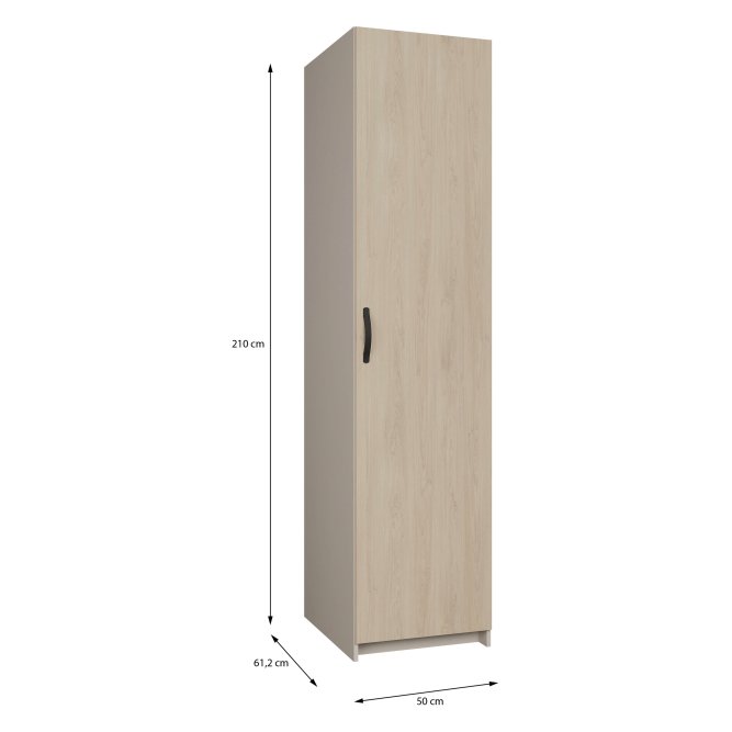 - Mebel o wymiarach: szerokość 50 cm x wysokość 210 cm x głębokość 61.2 cm, z różnymi opcjami przechowywania