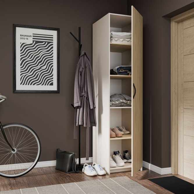 Wąska szafa o szerokości 50 cm z kolekcji TAHOE sprawdzi się w niewielkiej sypialni. Mebel posiada 4 półki, dzięki czemu będzie idealnym miejscem na poskładane w kostkę ubrania.