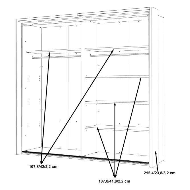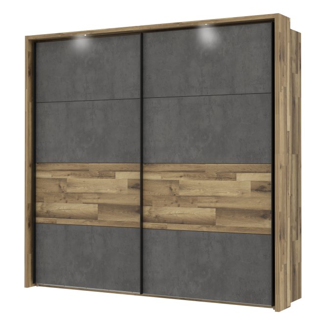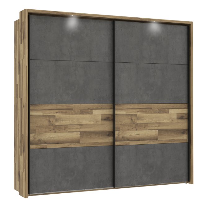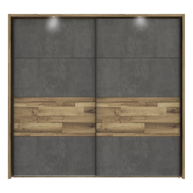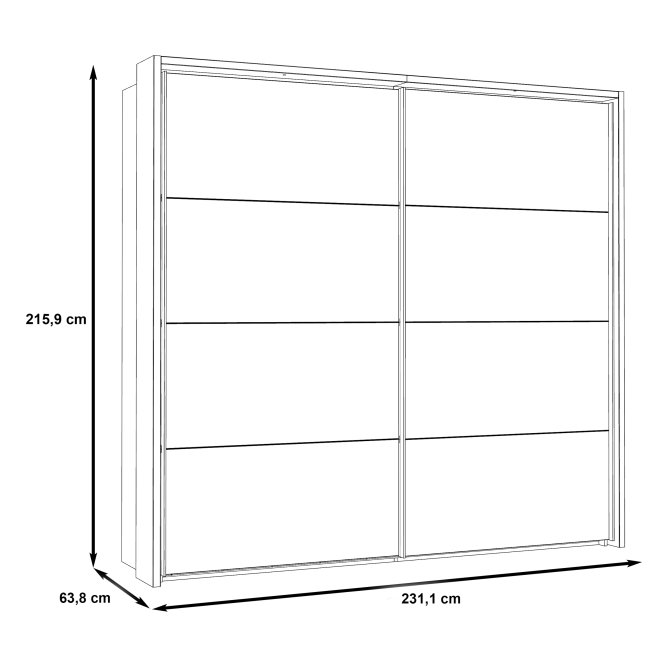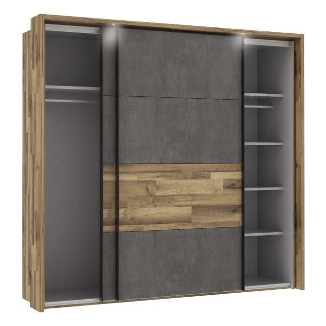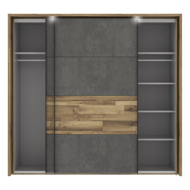 Niezwykle pojemna szafa ubraniowa z wygodnymi w użyciu przesuwnymi drzwiami będzie idealnym uzupełnieniem aranżacji sypialni. Podzielona na dwie części przestrzeń wewnątrz szafy zapewnia dużo miejsca do przechowywania odzieży, pościeli i innych przedmiotów codziennego użytku. Elegancki wygląd mebla podkreślony został oświetleniem zamontowanym w listwach dekoracyjnych.
