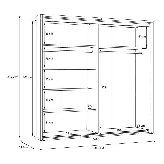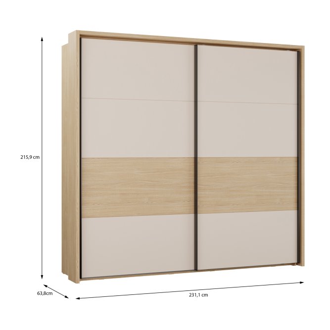 - Funkcjonalny mebel o wymiarach: szerokość 231.1 cm x wysokość 215.9 cm x głębokość 63.8 cm