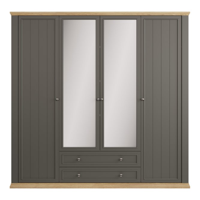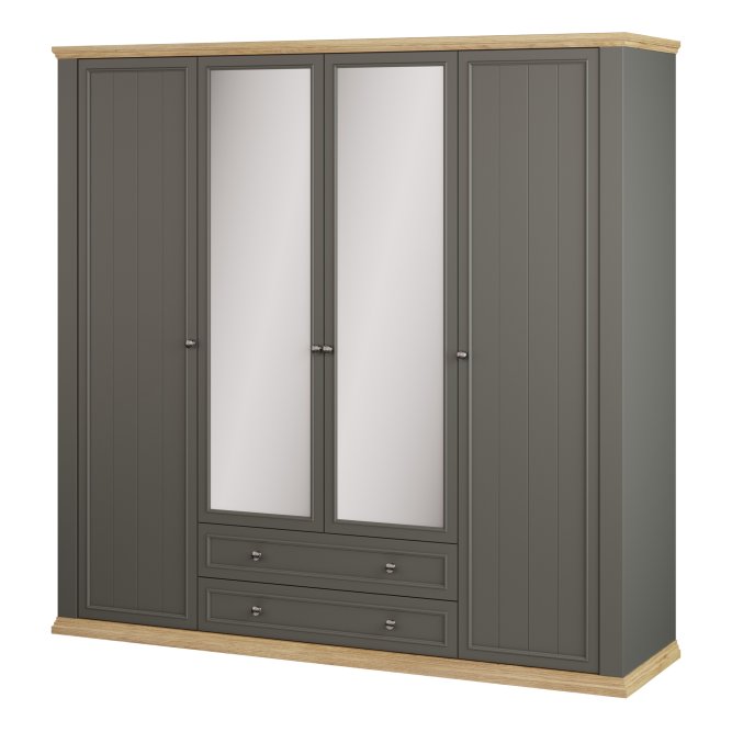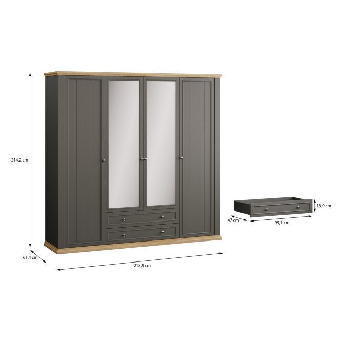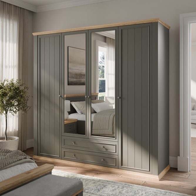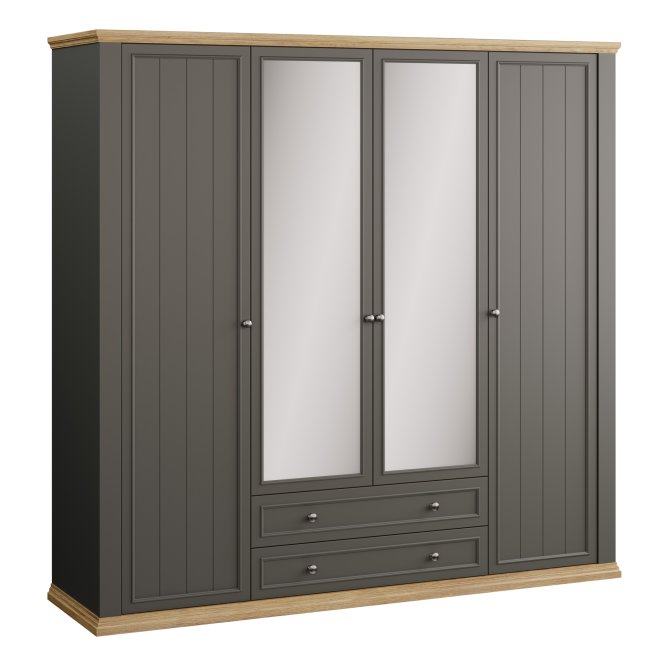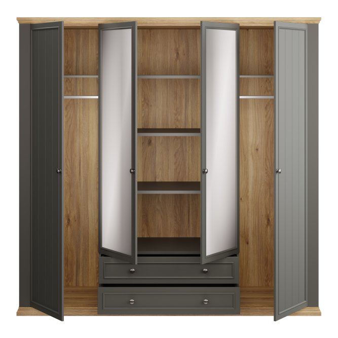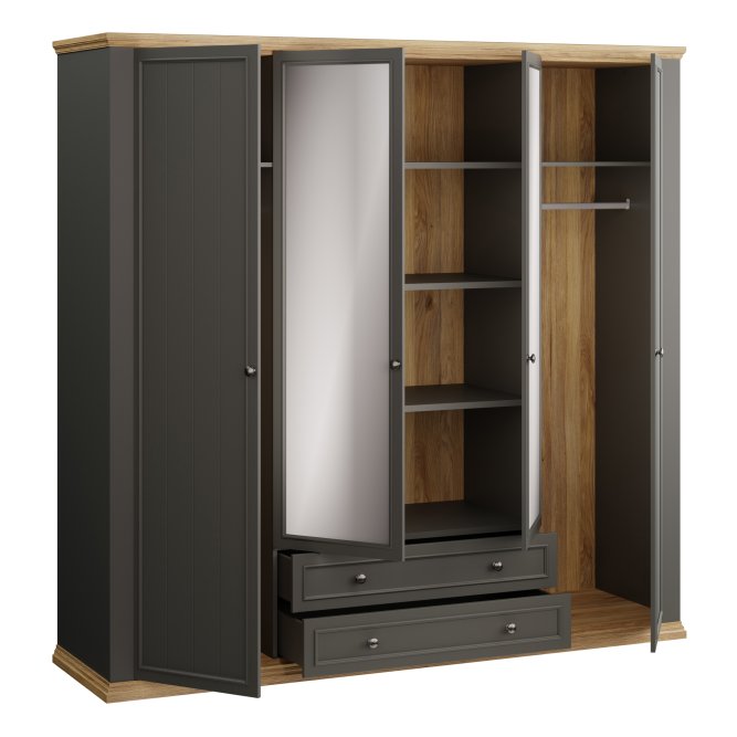 4-drzwiowa szafa z kolekcji PONTYPOOL będzie pięknie prezentować się w sypialni urządzonej w stylu prowansalskim lub rustykalnym. Wnętrze szafy zawiera zarówno półki, szuflady, jak i drążki ubraniowe, co pozwoli idealnie zorganizować garderobę.