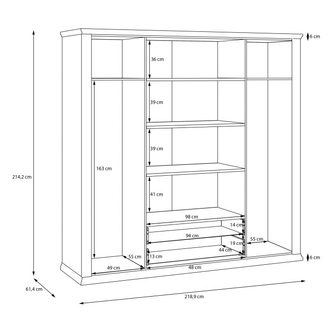 - Funkcjonalny mebel o wymiarach: szerokość 218.5 cm x wysokość 214.6 cm x głębokość 61.2 cm