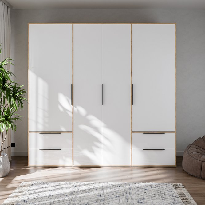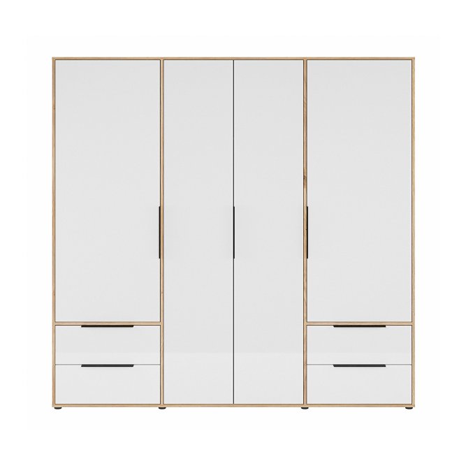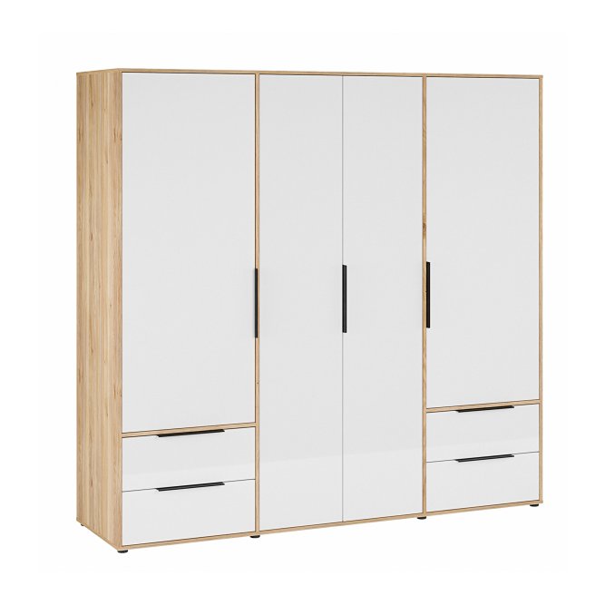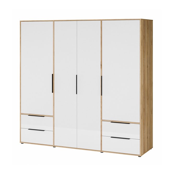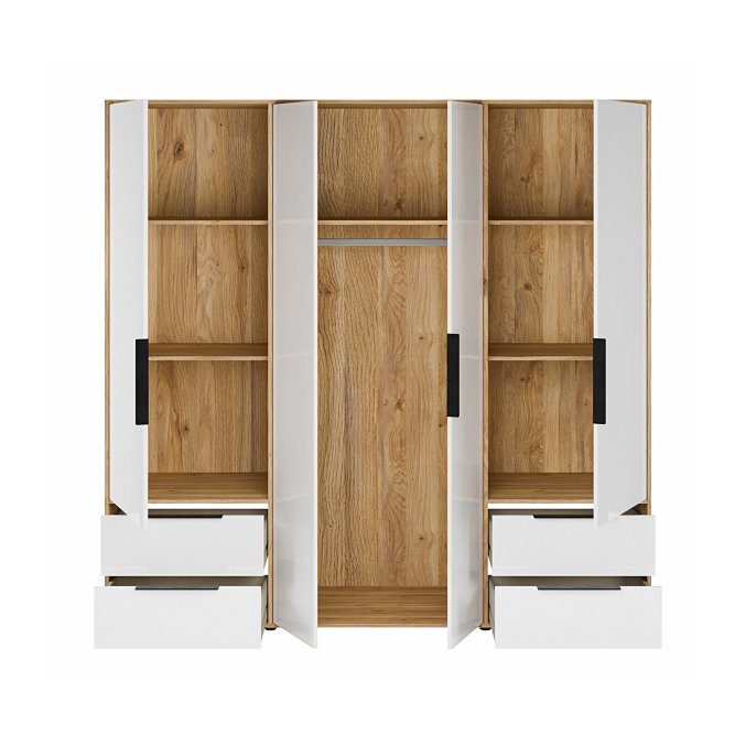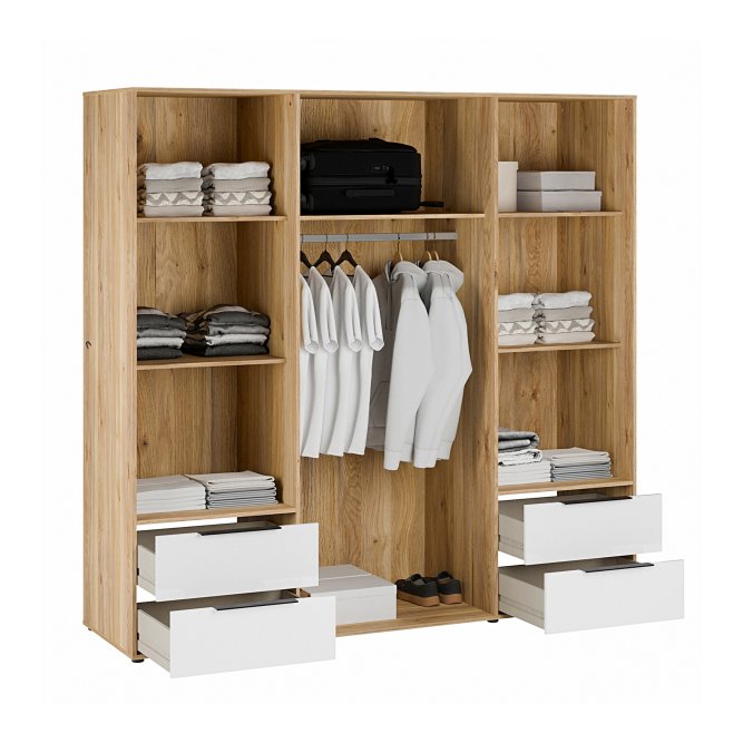 Szafa ORKNEY to nieodłączny element aranżacji sypialni oraz garderoby w nowoczesnym stylu. Szafę podzielono na 3 przestrzenie - środkowa z nich zawiera drążek na wieszaki i półkę, dwie skrajne wyposażono w 2 półki oraz 2 szuflady na bieliznę. Dzięki temu każda część garderoby znajdzie swoje miejsce.Pojemną szafę ORKNEY postaw w towarzystwie innych mebli z kolekcji i stwórz piękną zabudowę wnętrza.