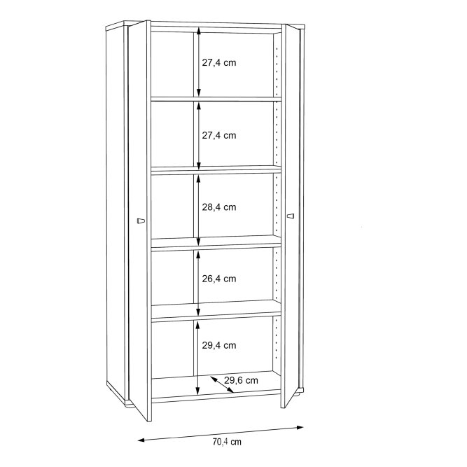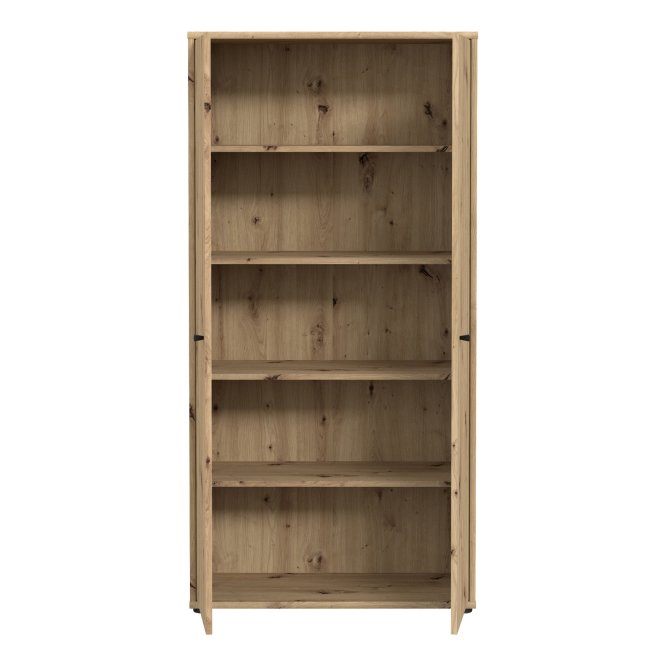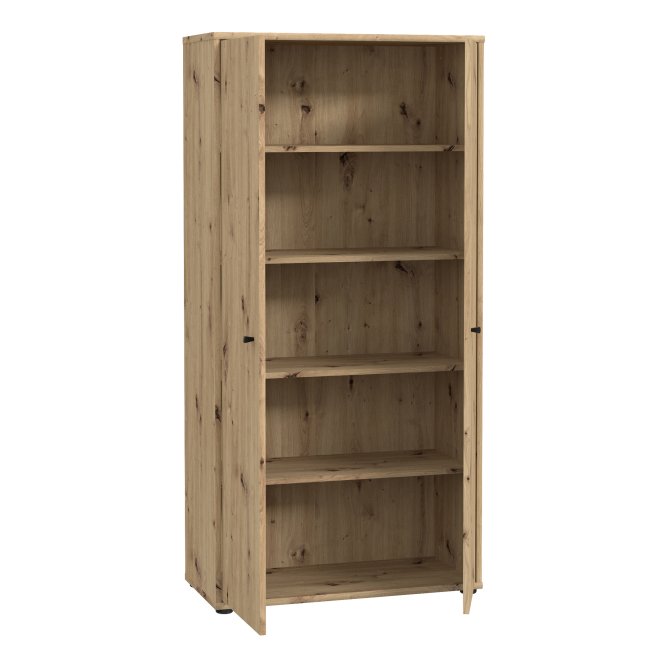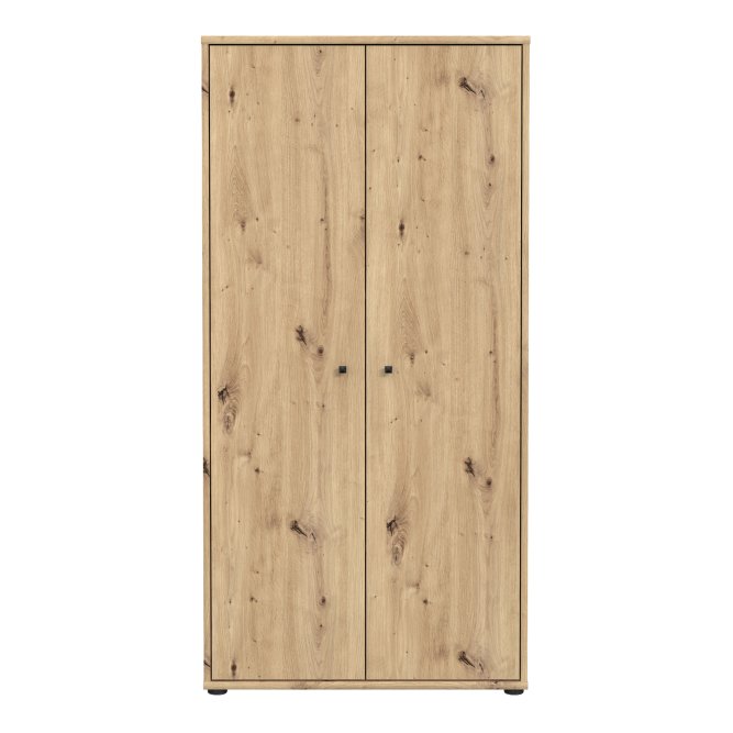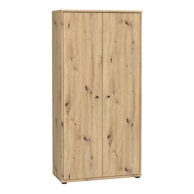Dwudrzwiowa szafa ubraniowa wykonana w dekorze Dąb Artisan to odpowiedź na potrzeby uporządkowanej garderoby w niewielkich przestrzeniach. Wnętrze z pięcioma półkami umożliwia przemyślaną segregację ubrań, dodatków i bielizny, dzięki czemu wszystko ma swoje miejsce. Smukła bryła i ciepła, naturalna kolorystyka wprowadzą do wnętrza spokojną, nowoczesną estetykę. Minimalistyczne, czarne uchwyty typu gałka dodają subtelnego kontrastu i ułatwiają codzienne użytkowanie. Szafa to praktyczny i stylowy element wyposażenia idealny do sypialni, przedpokoju czy pokoju gościnnego.