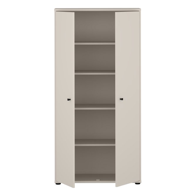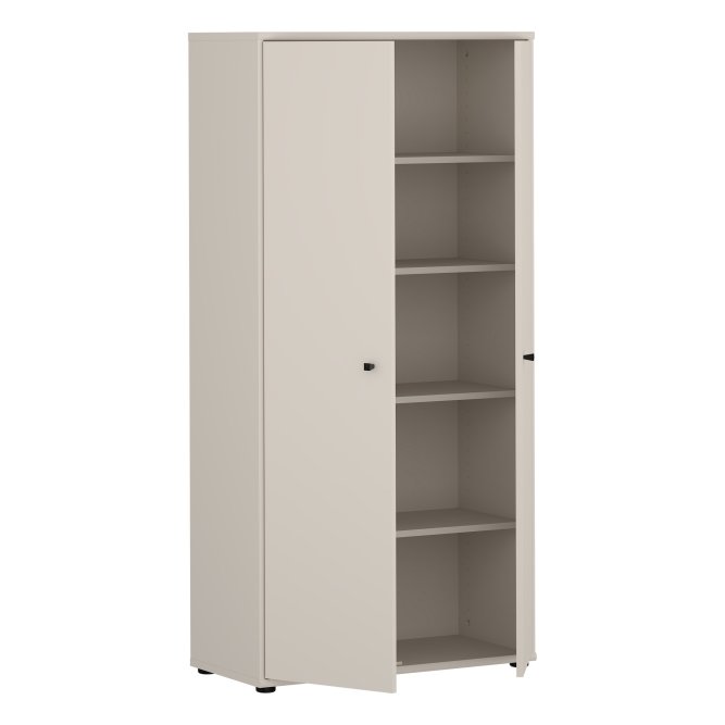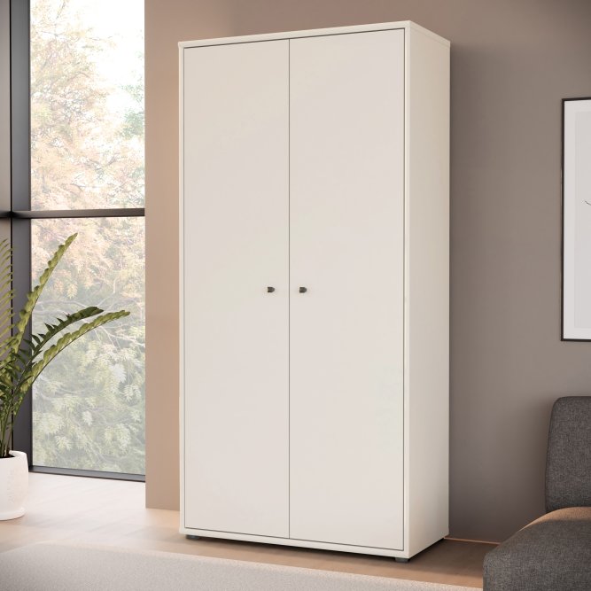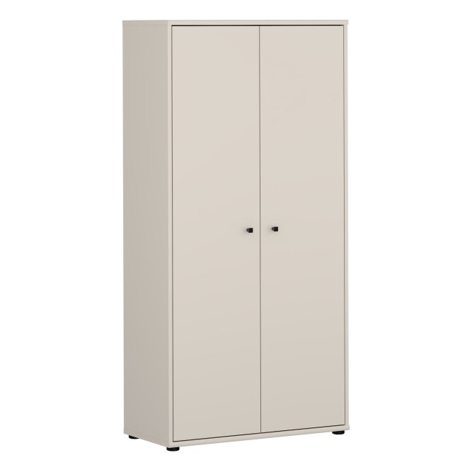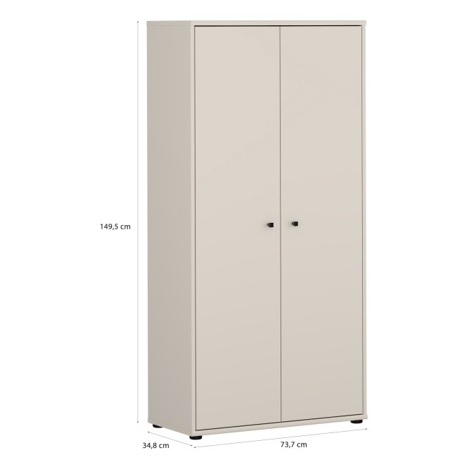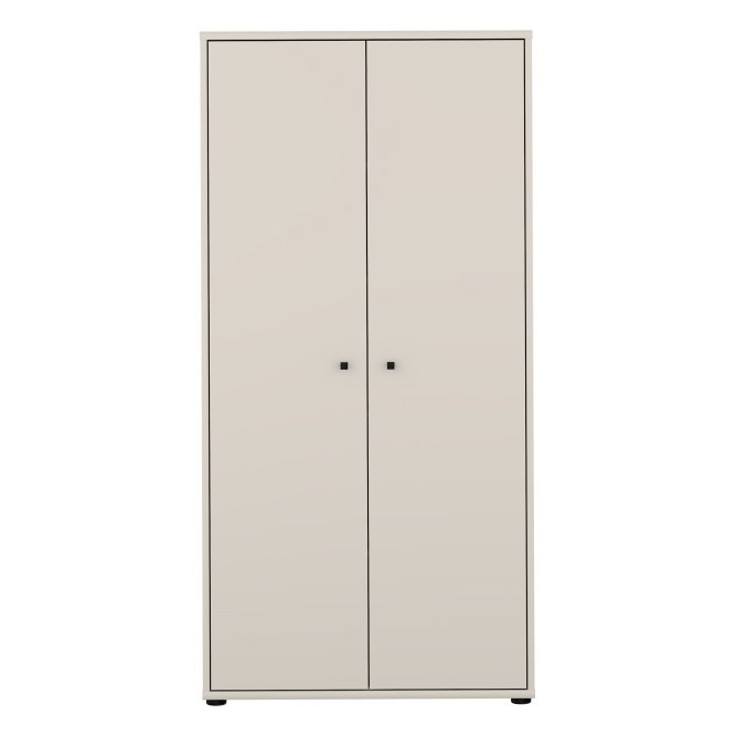 Dwudrzwiowa szafa ubraniowa w stylowym piaskowym kolorze to elegancka odpowiedź na potrzeby uporządkowanej garderoby w niewielkich przestrzeniach. Wnętrze z pięcioma półkami umożliwia przemyślaną segregację ubrań, dodatków i bielizny, dzięki czemu wszystko ma swoje miejsce. Smukła bryła i neutralny, ciepły odcień piasku wprowadzą do wnętrza spokojną, nowoczesną estetykę. Minimalistyczne, czarne uchwyty typu gałka dodają subtelnego kontrastu i ułatwiają codzienne użytkowanie. Szafa to praktyczny i stylowy element wyposażenia idealny do sypialni, przedpokoju czy pokoju gościnnego.