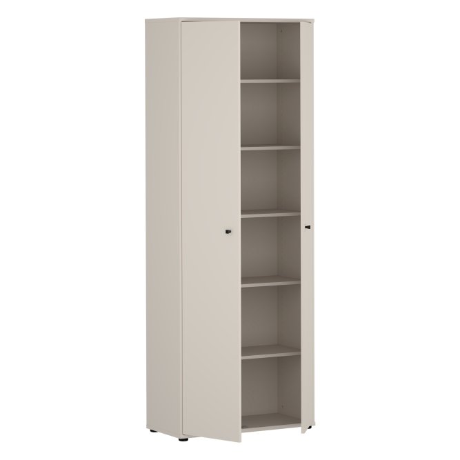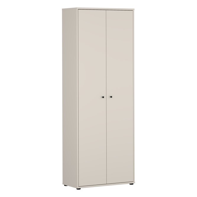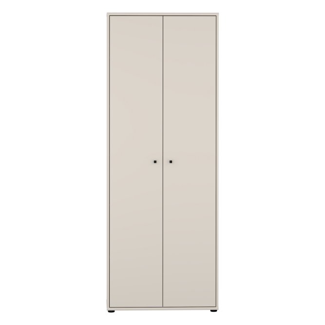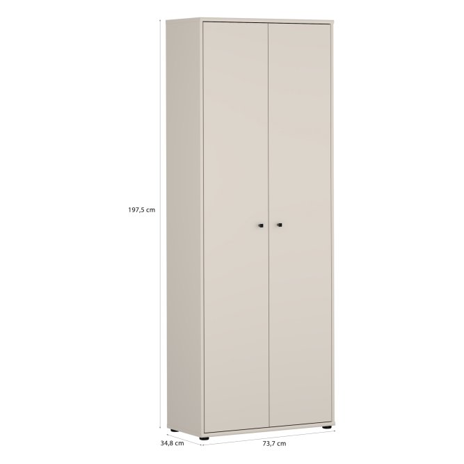Dwudrzwiowa szafa ubraniowa w stylowym piaskowym kolorze to elegancka odpowiedź na potrzeby uporządkowanej garderoby w niewielkich przestrzeniach. Wnętrze z sześcioma półkami umożliwia przemyślaną segregację ubrań, dodatków i bielizny, dzięki czemu wszystko ma swoje miejsce. Smukła bryła wprowadzi do wnętrza nowoczesną estetykę. Minimalistyczne, czarne uchwyty typu gałka dodają subtelnego kontrastu i ułatwiają codzienne użytkowanie. Wysoka forma szafy wykorzystuje przestrzeń pionową tam, gdzie miejsca jest mało. To praktyczny i stylowy element wyposażenia idealny do sypialni, przedpokoju czy pokoju gościnnego.