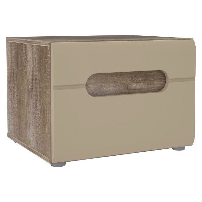 Nowoczesna szafka nocna z kolekcji TIZIANO idealnie dopełni wnętrze sypialni urządzone z innymi meblami z kolekcji. Korpus w kolorze Dębu Antycznego łączy się z frontami w Beżowym Połysku tworząc funkcjonalny i designerski mebel.