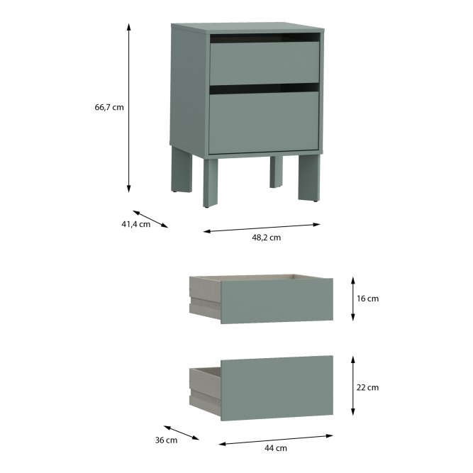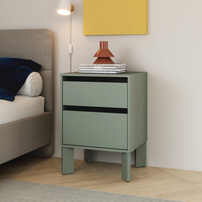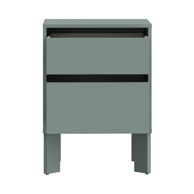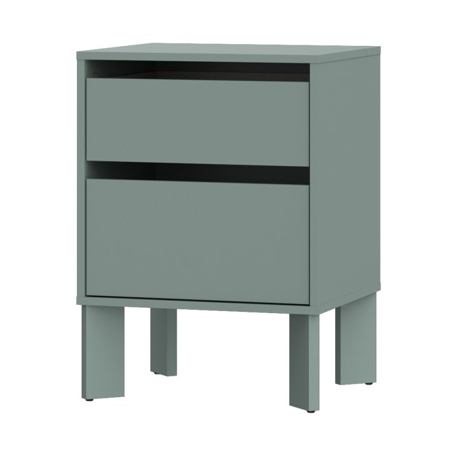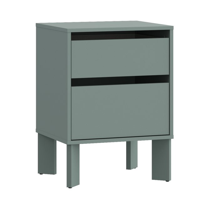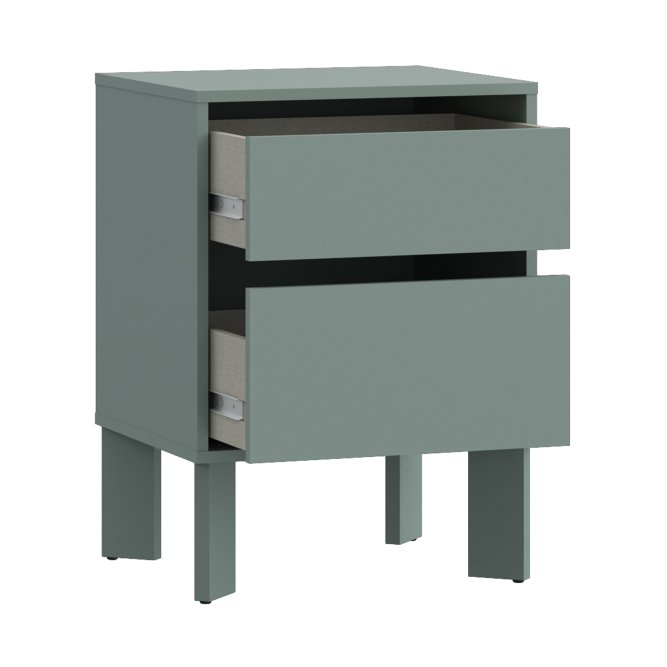 Szafka nocna Tahoe w dekorze: Szałwia to stylowy dodatek do sypialni, łączący nowoczesny design z funkcjonalnością. Jej smukła konstrukcja z wysokimi nóżkami nadaje wnętrzu lekkości, a ciepły odcień szałwii wprowadza przytulną atmosferę. Dwie pojemne szuflady zapewniają wygodne przechowywanie niezbędnych drobiazgów, a solidna płyta wiórowa gwarantuje trwałość. To idealne rozwiązanie dla osób ceniących minimalistyczny styl z nutą elegancji.