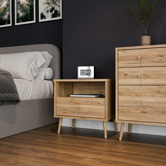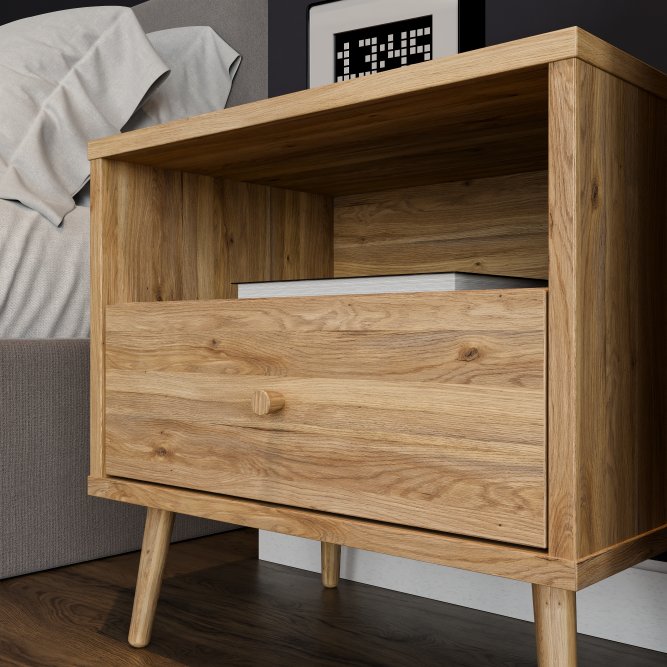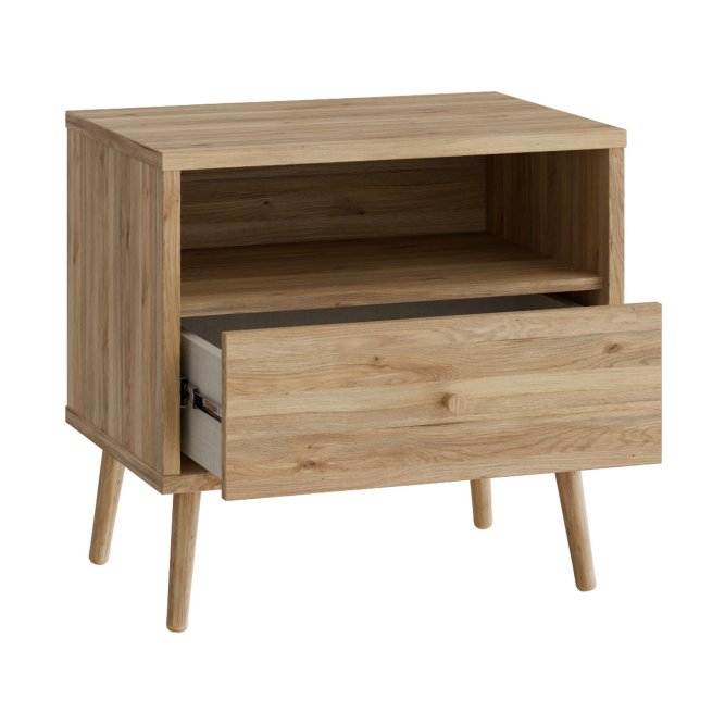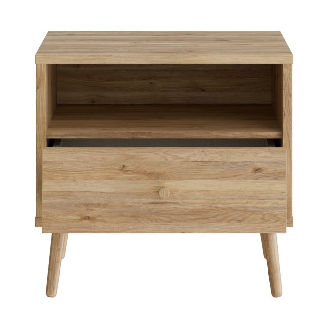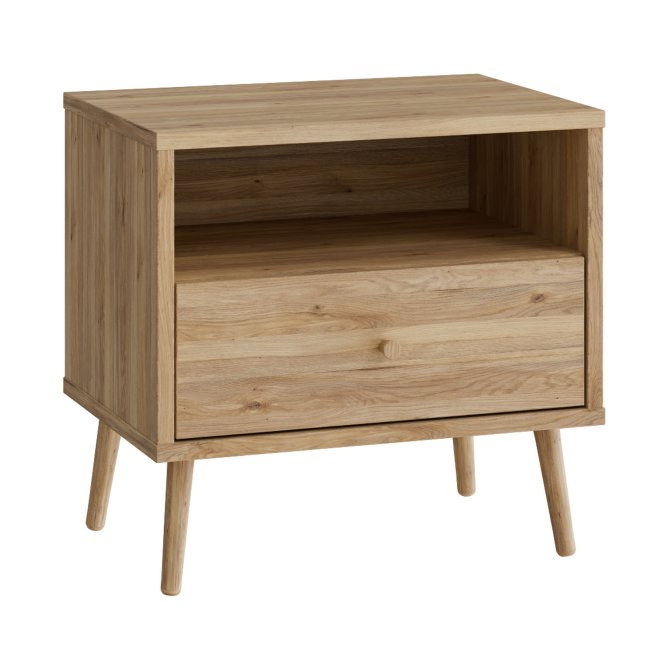 Szafka nocna Harllson w dekorze: Dąb Mauvella to elegancki i funkcjonalny dodatek do każdej sypialni. Jej minimalistyczny design z otwartą wnęką i pojemną szufladą doskonale sprawdzi się do przechowywania niezbędnych przedmiotów. Stożkowe nóżki w naturalnym kolorze dodają lekkości i nowoczesnego charakteru.