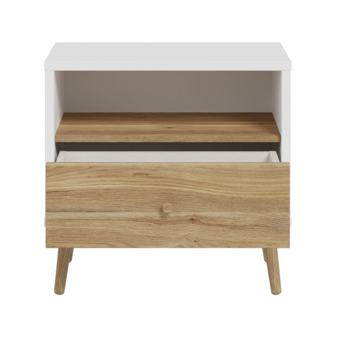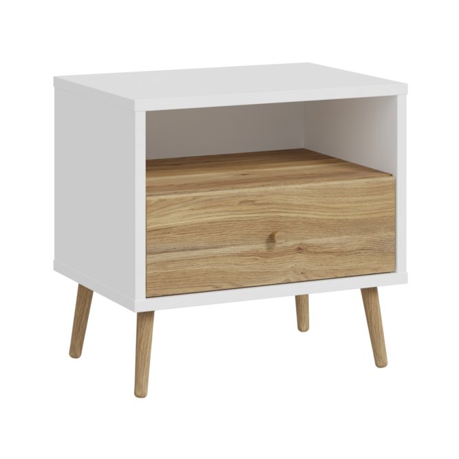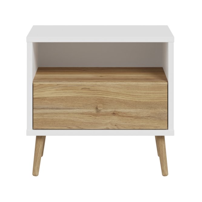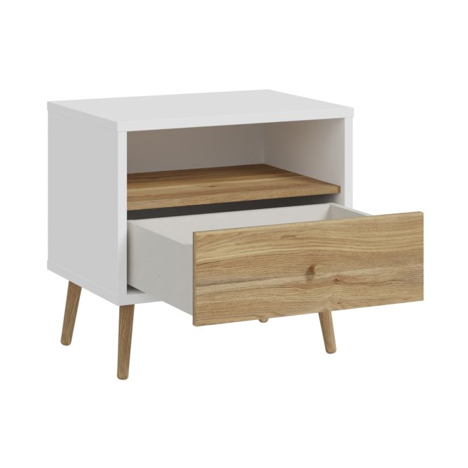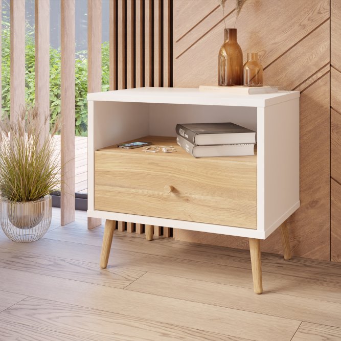 Kilka ważnych cech wyróżnia szafkę nocną HARLLSON spośród wielu innych mebli. Po pierwsze: sposób montażu. Składanie mebli jeszcze nigdy nie było tak szybkie i proste! Montaż może trwać nawet do 10 razy krócej niż w przypadku tradycyjnej metody składania, a dodatkowo nie wymaga używania prawie żadnych narzędzi, bo większość elementów łączy się ze sobą na “click”. Umożliwia to Easy Klix, innowacyjny system oparty na technologii Threespine ID®, który pozwala również na wielokrotny demontaż mebla i jego ponowne złożenie. W razie przeprowadzki nie musisz się martwić, że po rozłożeniu szafka nocna się zniszczy. Przekonaj się jak prosty i przyjemny może być teraz montaż i demontaż mebla! Druga ważna cecha szafki nocnej, a także całej kolekcji HARLLSON Easy Klix by FORTE, to design - współczesny, ale jednocześnie przywołujący to, co najlepsze w stylu minionych epok. Subtelne w formie i kolorystyce meble łączą w sobie piękno i funkcjonalność. Wszystkie modele osadzono na drewnianych, wysokich, lekko skośnych nóżkach, dzięki temu nawet 3-drzwiowa szafa jest wizualnie lekka i nie przytłoczy pomieszczenia. Delikatne drewniane uchwyty w formie gałek podkreślają styl kolekcji i są idealnie dopasowane do poszczególnych opcji kolorystycznych. Meble będą wspaniałą bazą do aranżacji wygodnego pokoju dziennego oraz sypialni w duchu skandynawskim, scandi boho czy retro. Szafka nocna HARLLSON, w efektownym połączeniu dekorów białego i Dąb Mauvella, to nie tylko praktyczna baza pod budzik i lampkę nocną, ale przede wszystkim modny mebel do sypialni. Otwarta przestrzeń pod blatem ułatwi przechowywanie aktualnie czytanej książki, natomiast w przechowywaniu leków, kosmetyków lub innych drobiazgów sprawdzi się szuflada. Została ona osadzona na prowadnicach z pełnym wysuwem, dzięki czemu korzystanie z mebla jest wyjątkowo komfortowe.