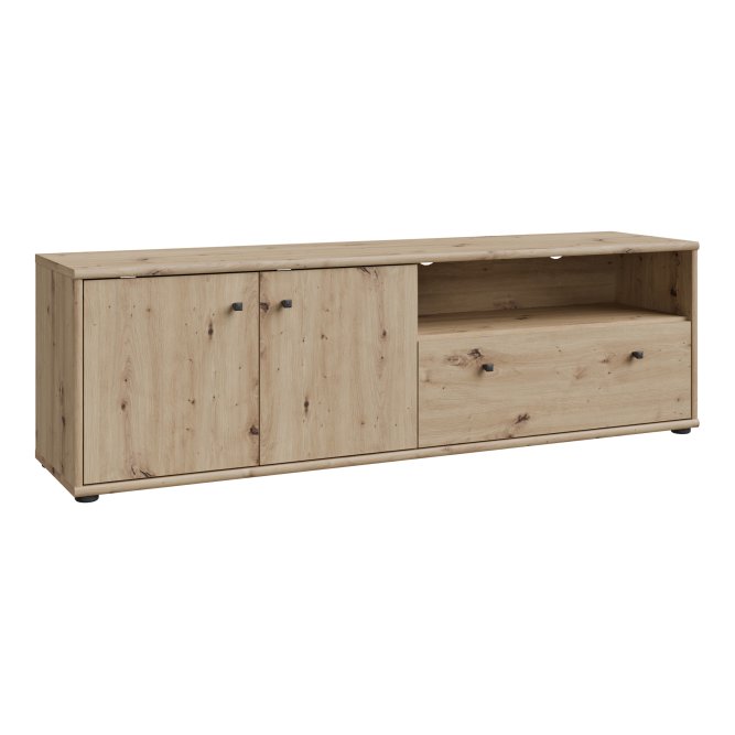 Niska szafka RTV o wysokości niespełna 44 cm będzie podstawą strefy rozrywki w Twoim salonie. Konstrukcja mebla wyposażona jest w dwudrzwiową zamykaną szafkę, szufladę i otwartą półkę wnękową, dzięki czemu mebel gwarantuje odpowiednio dużo miejsca do przechowywania elektroniki i innych przedmiotów przydatnych podczas relaksu przed TV. Czarne minimalistyczne uchwyty typu gałka zapewniają łatwy dostęp do zawartości, natomiast otwory w tylnej ścianie szafki umożliwiają łatwą organizację kabli i komfortowe przechowywanie sprzętu RTV.