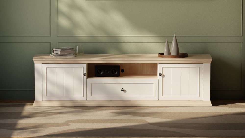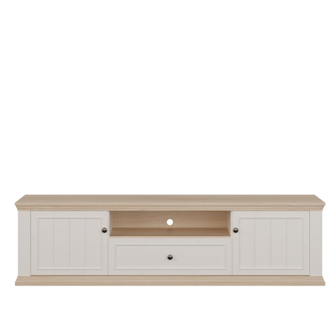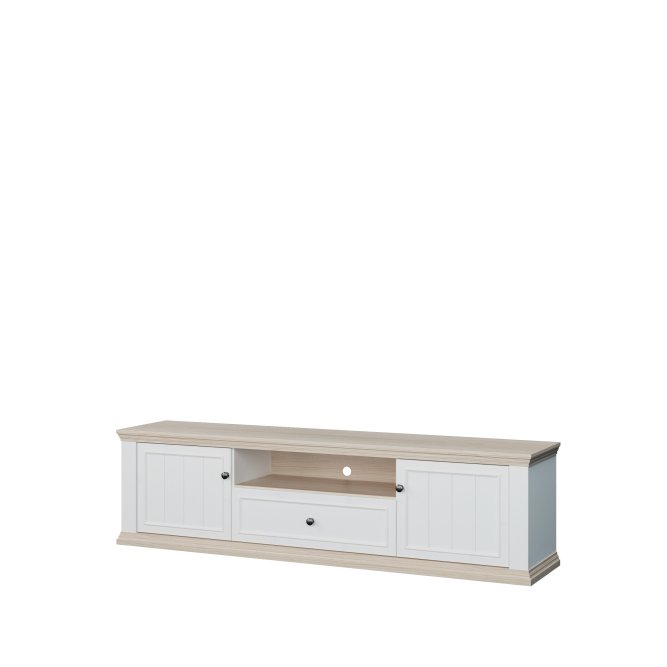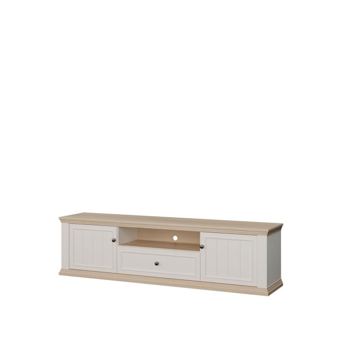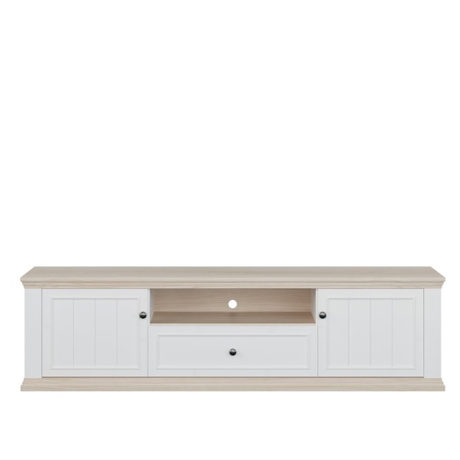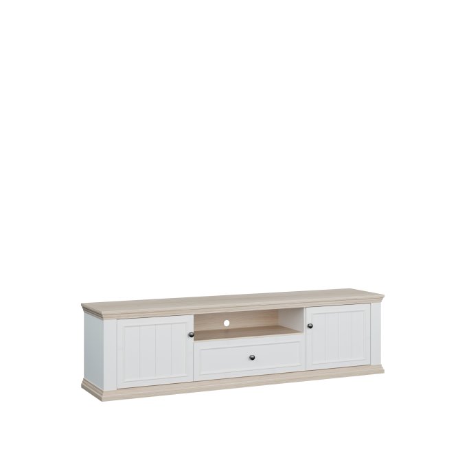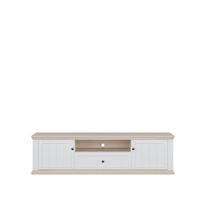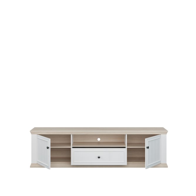 Szafka RTV PONTYPOOL o szerokości niemal 200 cm będzie podstawą strefy rozrywki w Twoim salonie. Na blacie możesz ustawić telewizor o wielkości do 81 cali. Mebel wyposażony jest w dwie półki, szufladę zamontowaną na prowadnicy Quadro Soft Close oraz otwartą wnękę, która pomogą w komfortowym przechowywaniu sprzętu RTV. Szafka posiada otwory w tylnej ścianie, umożliwiające łatwą organizację kabli. Połączenie kolorystyczne bieli z dekorem Dębu Rivia, a także fronty z wyraźną strukturą dodają całości wyjątkowego charakteru.