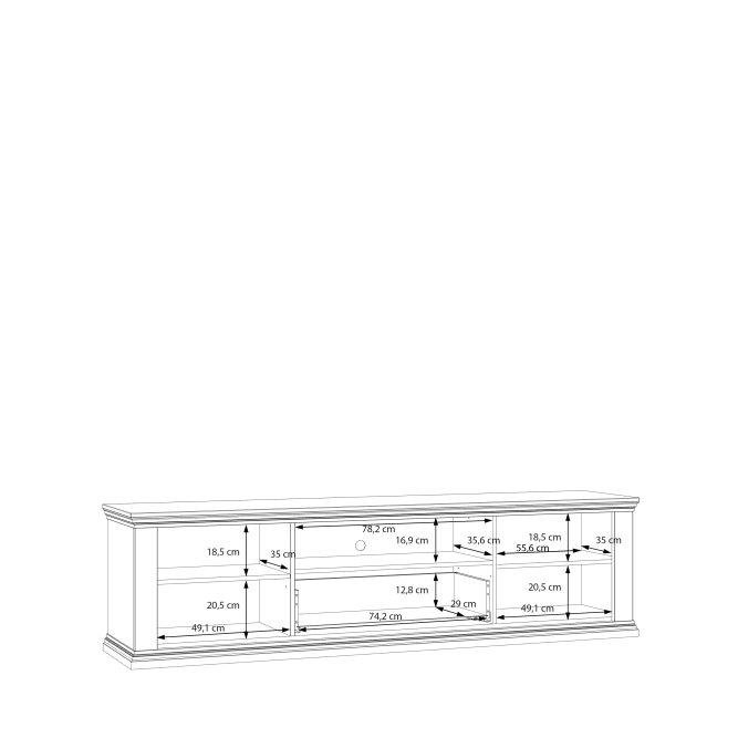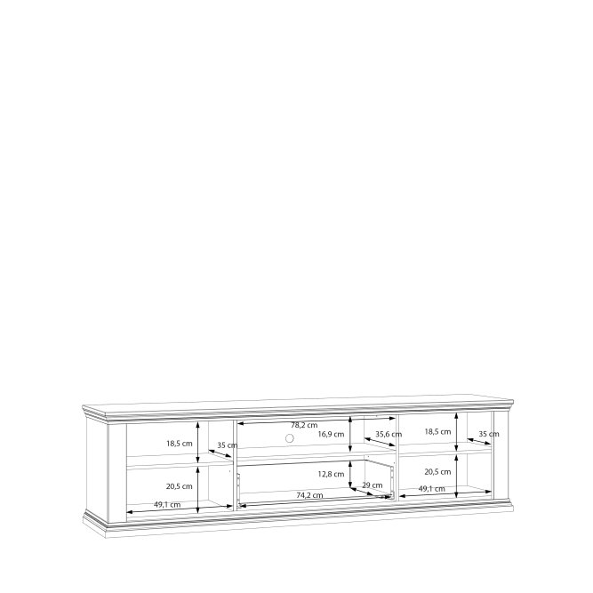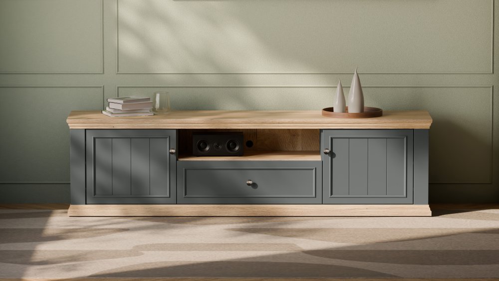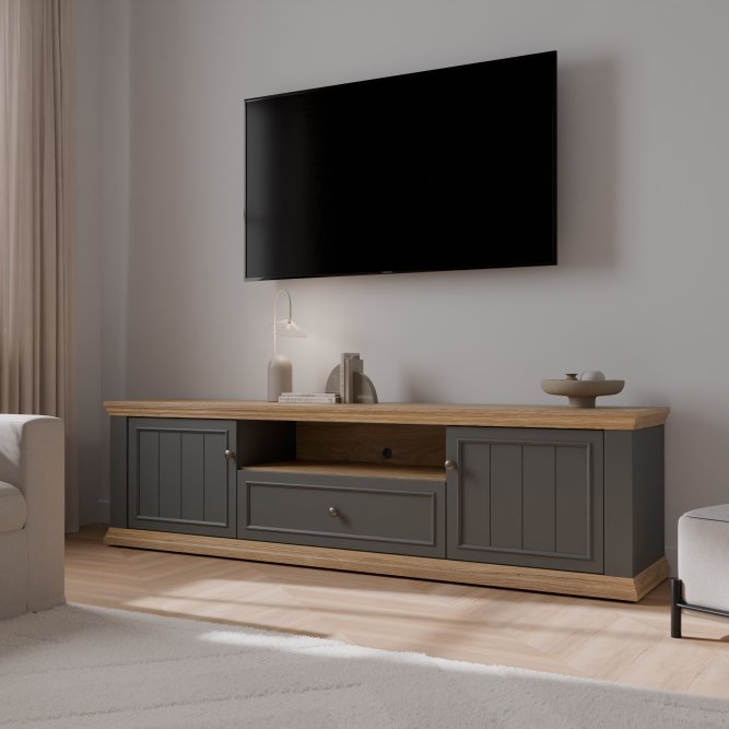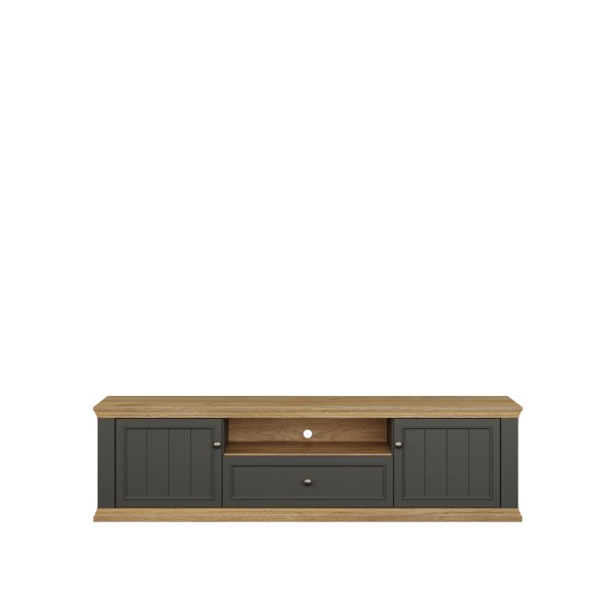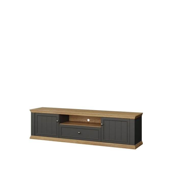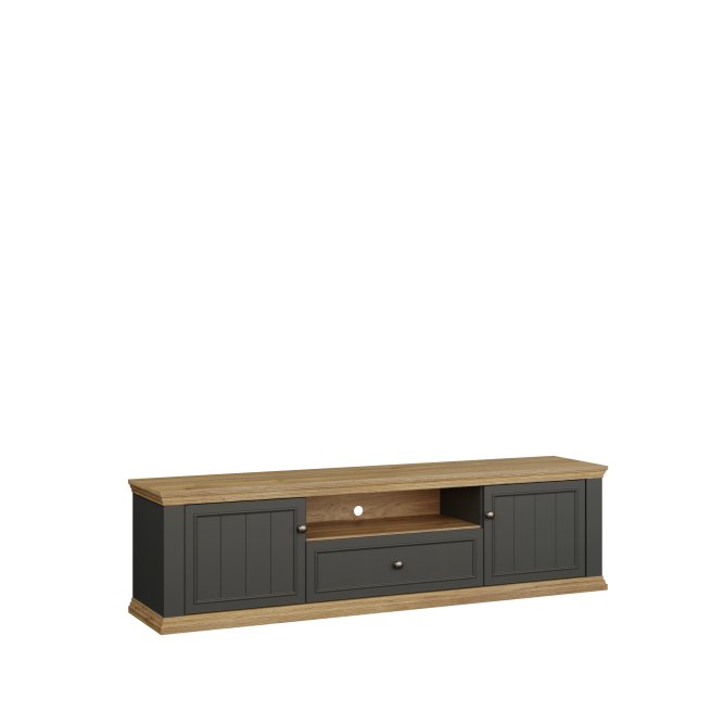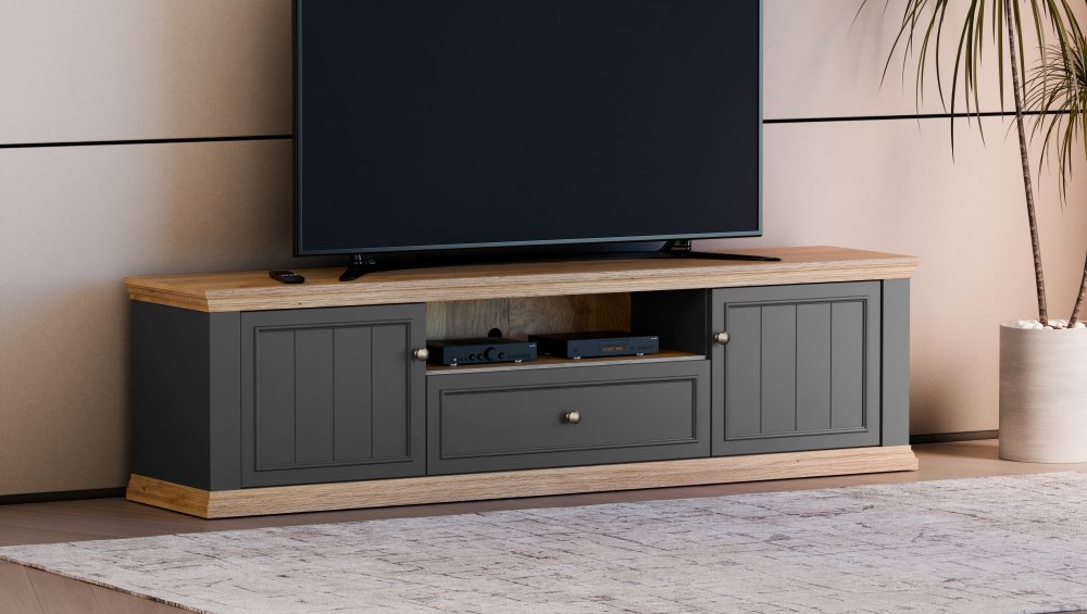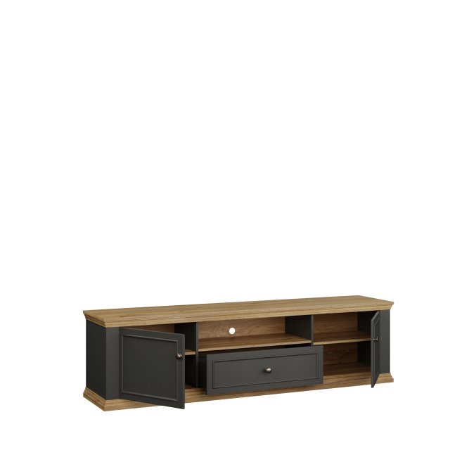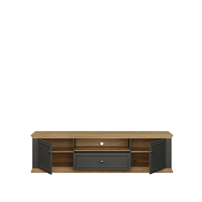 Szafka RTV PONTYPOOL o szerokości niemal 200 cm będzie podstawą strefy rozrywki w Twoim salonie. Na blacie możesz ustawić telewizor o wielkości do 81 cali. Mebel wyposażony jest w dwie półki, szufladę zamontowaną na prowadnicy Quadro Soft Close oraz otwartą wnękę, która pomogą w komfortowym przechowywaniu sprzętu RTV. Szafka posiada otwory w tylnej ścianie, umożliwiające łatwą organizację kabli.