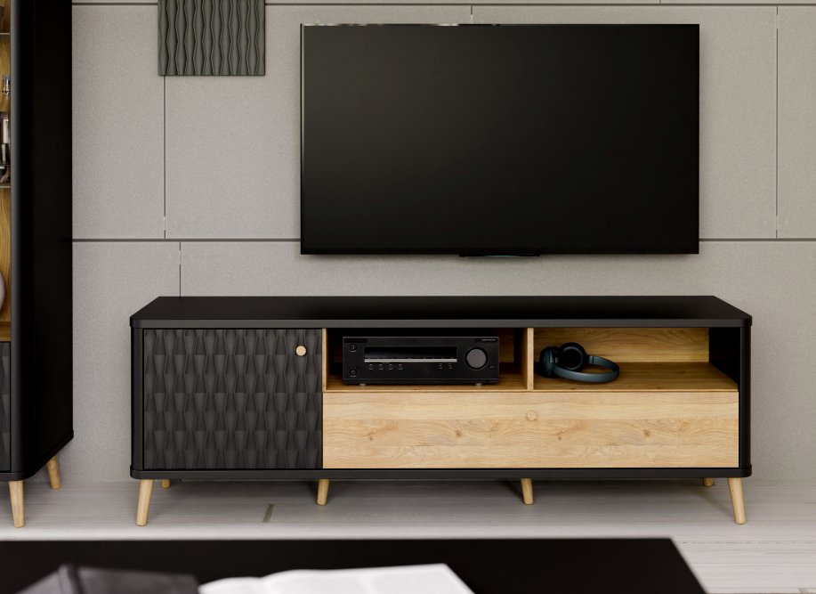 - Szafka RTV wykonana w połączeniu dekorów: Dąb Mauvella / Czarny