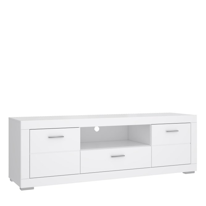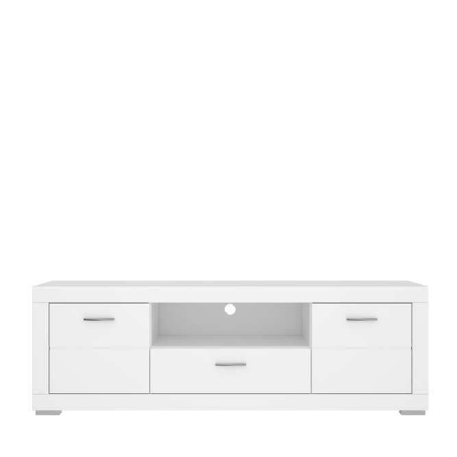 Szafka RTV wykonana jest w Białym dekorze. Mebel posiada szafki, szufladę i otwarte półki umieszczone między pogrubionymi ramami. Szafka świetnie będzie prezentować się w pokoju dziennym lub młodzieżowym z pozostałymi meblami z kolekcji SNOW.