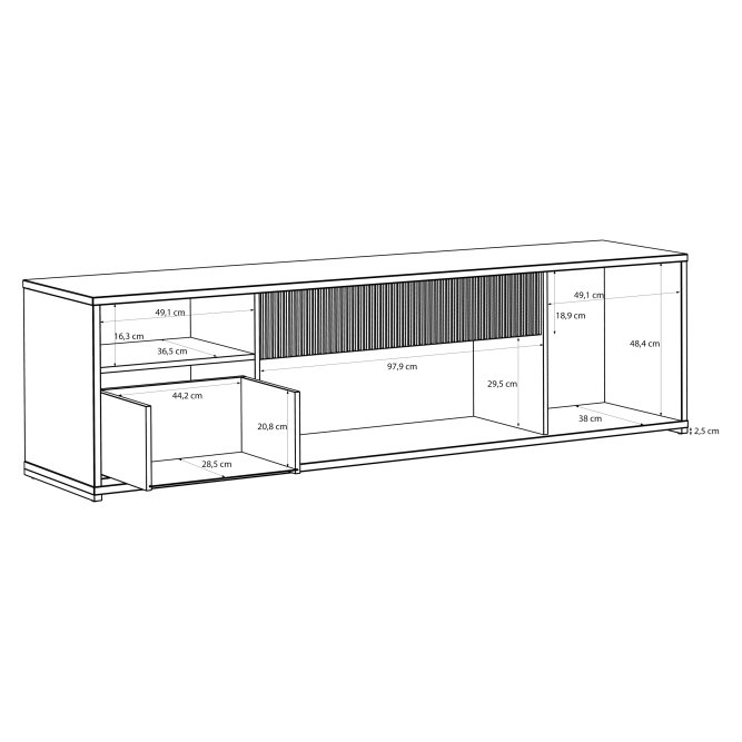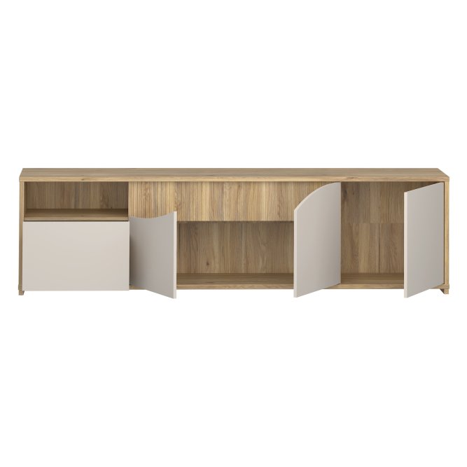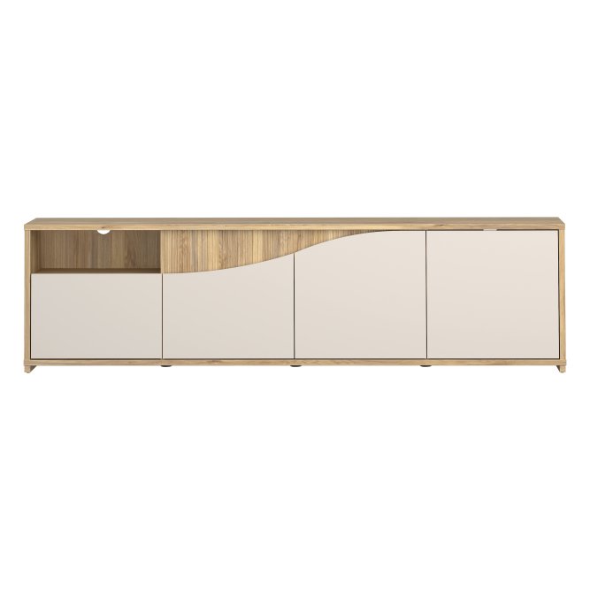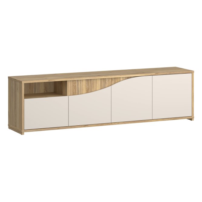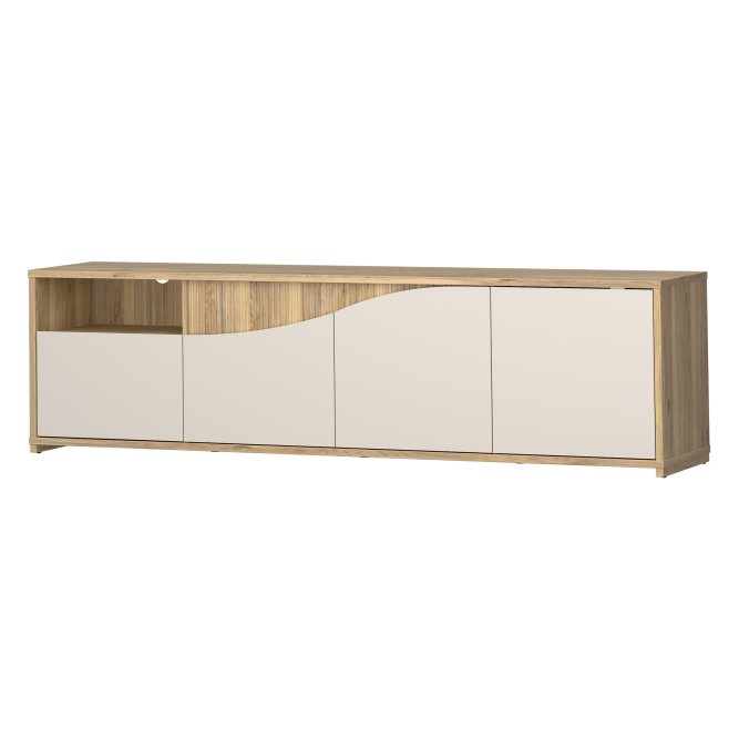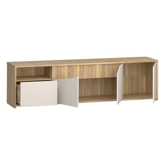 Szafka RTV z kolekcji POEM będzie podstawą strefy rozrywki w Twoim salonie. Na blacie możesz ustawić telewizor o wielkości do 84 cali. (3) szafki, (1) szuflada i (1) wnęka otwarta pomogą w komfortowym przechowywaniu sprzętu RTV. Natomiast otwory w tylnej ścianie szafki umożliwią łatwą organizację kabli.