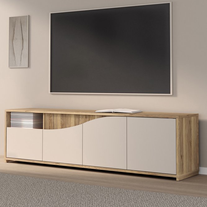 - Szafka RTV wykonana w połączeniu dekorów: Dąb Mauvella / Piaskowy