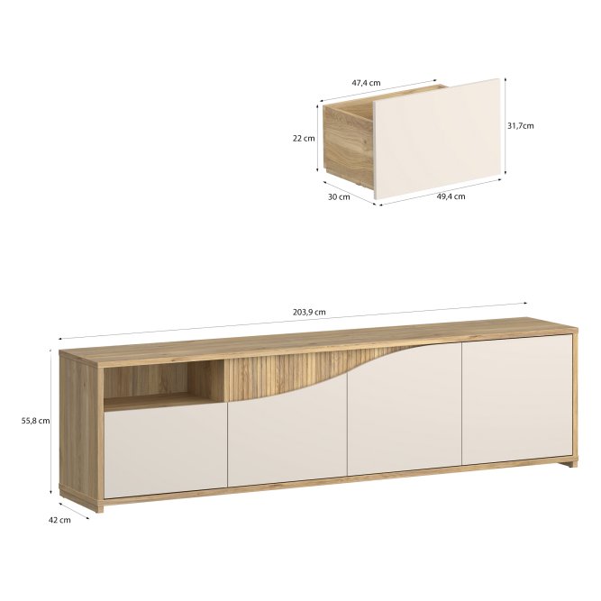 - Wymiary: szerokość 203.9 cm, wysokość 55.8 cm, głębokość 42 cm