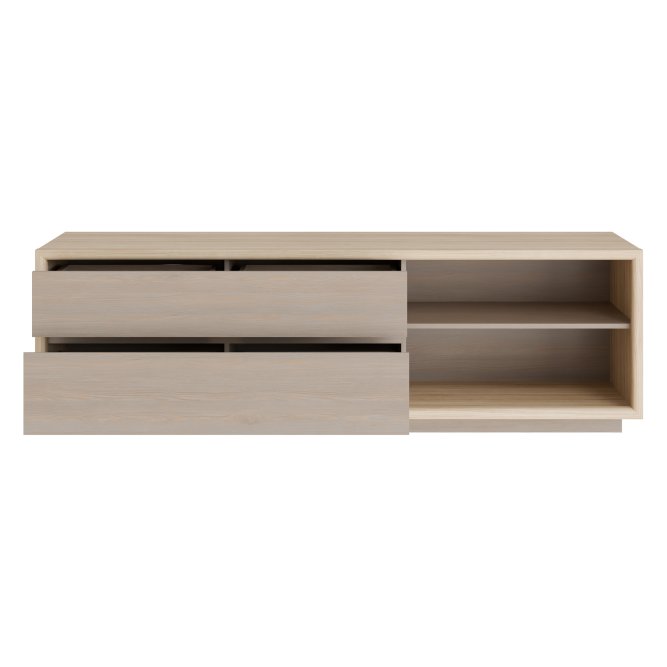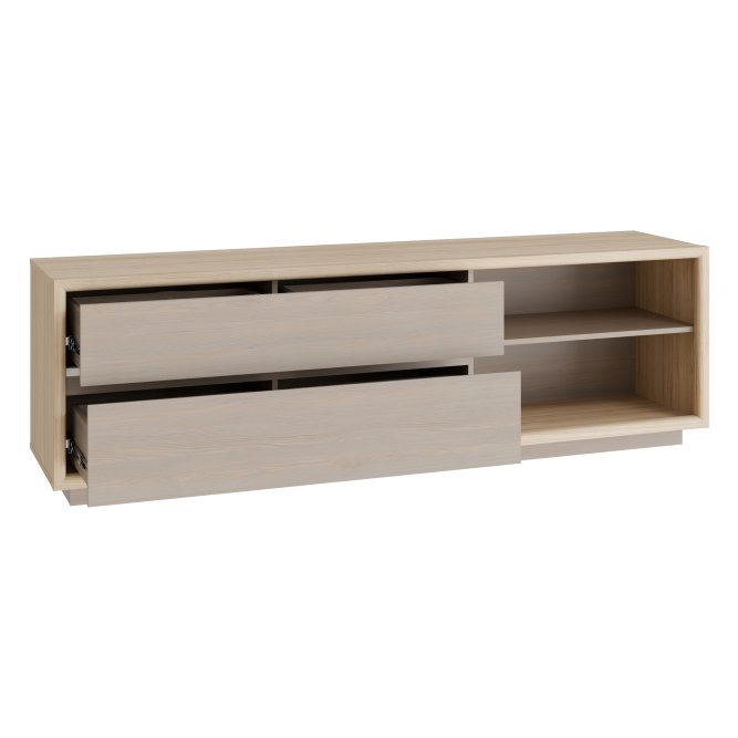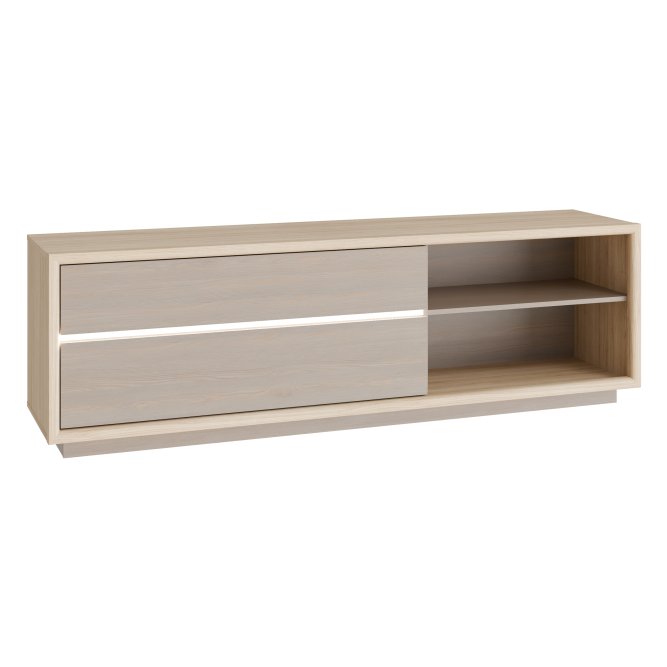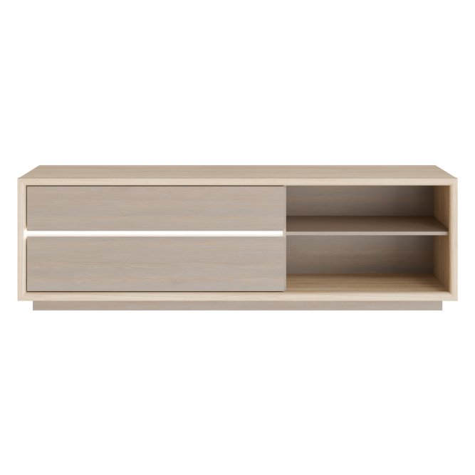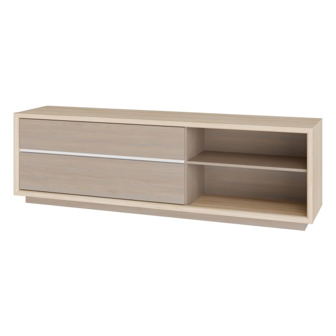 Szafka RTV z kolekcji FICAR będzie podstawą strefy rozrywki w Twoim salonie. Na blacie możesz ustawić telewizor o wielkości do 75 cali. (2) szuflady i (2) otwarte wnęki pomogą w komfortowym przechowywaniu sprzętu RTV. Natomiast otwory w tylnej ścianie szafki umożliwią łatwą organizację kabli.