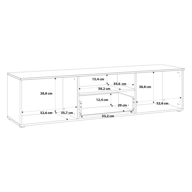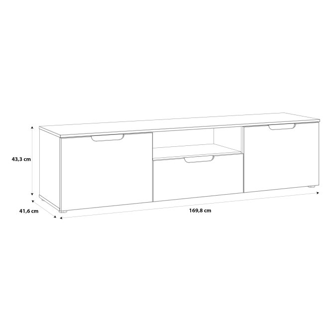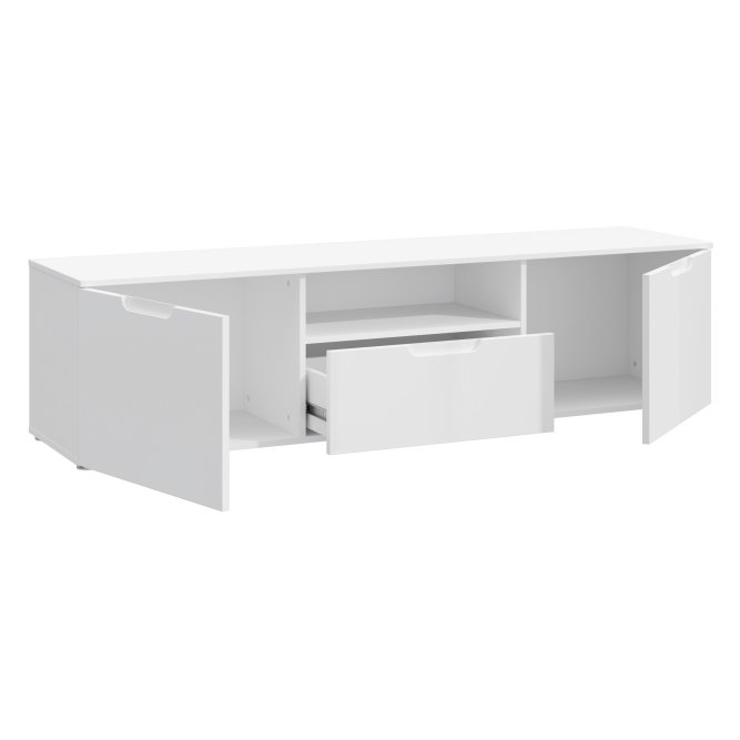 Elegancka szafka RTV w stylu nowoczesnym w Białym dekorze doskonale wpasuje się w wystrój pokoju dziennego. Posiada odpowiednio dużo miejsca do przechowywania sprzętu RTV.