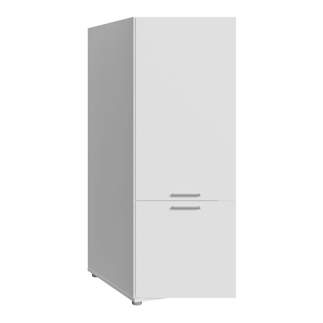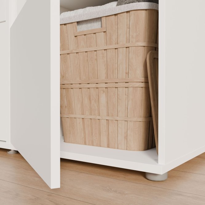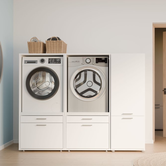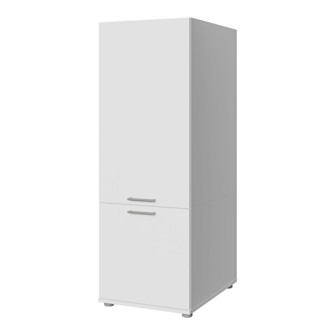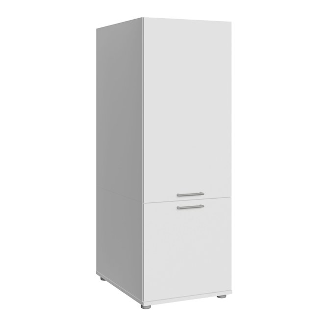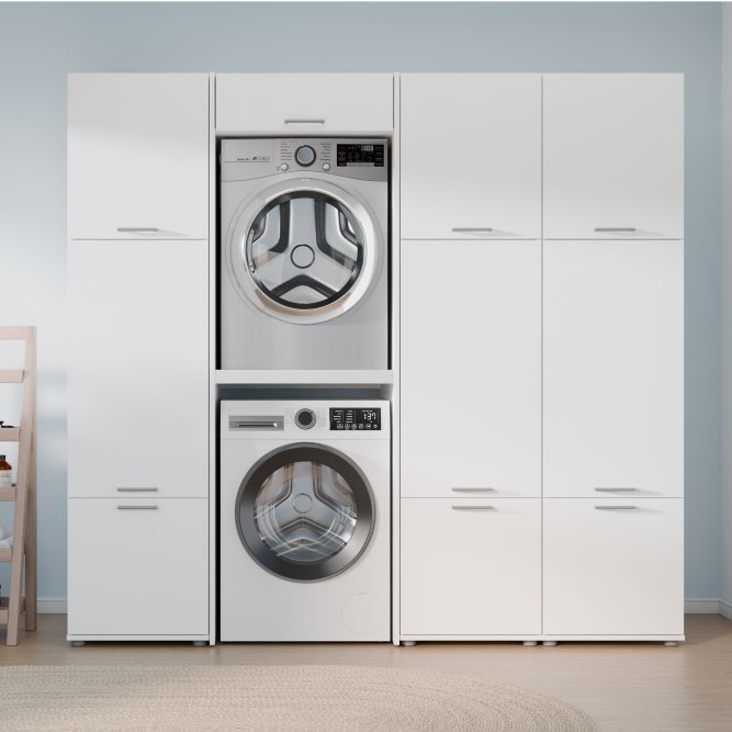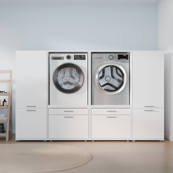 Dwudrzwiowa szafka WASHCAB to rozwiązanie, które wspiera porządek w pralni, oferując zamykane przechowywanie i dyskretny wygląd. Górna część szafki skrywa trzy wygodne półki o zróżnicowanej wysokości (25, 29 i 31 cm), które pozwalają uporządkować detergenty, tekstylia i akcesoria. W dolnej części znajdziesz pojemną komorę z jedną półką o wysokości 47 cm, idealną na większe pojemniki i sprzęty. Komfort codziennym czynnościom nadaje system cichego domyku, a metalowe, podłużne uchwyty w stalowym kolorze ułatwiają dostęp do zawartości szafek. Dwudrzwiowa pionowa szafka z kolekcji WASHCAB to rozwiązanie, które idealnie komponuje się z nowoczesnymi wnętrzami, a jej kompaktowe wymiary (50 × 143,3 × 67,5 cm) sprawiają, że świetnie sprawdzi się także w mniejszych pomieszczeniach, wprowadzając ład i funkcjonalność do strefy prania.