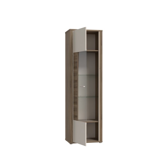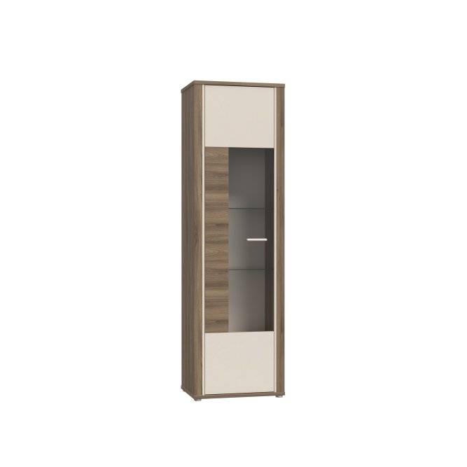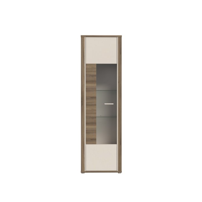 - Witryna wykonana w modnym połączeniu dekorów: Piaskowy / Dąb Valencia