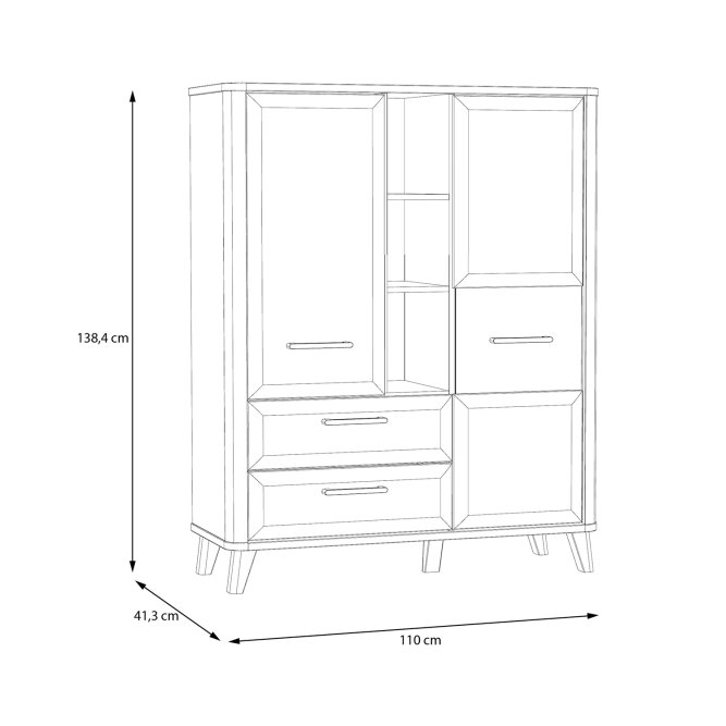 Wymiary witryny: szerokość: 110 cm x wysokość: 138,4 cm x głębokość:41,3 cm