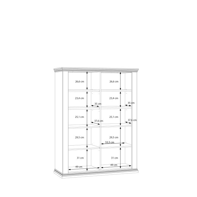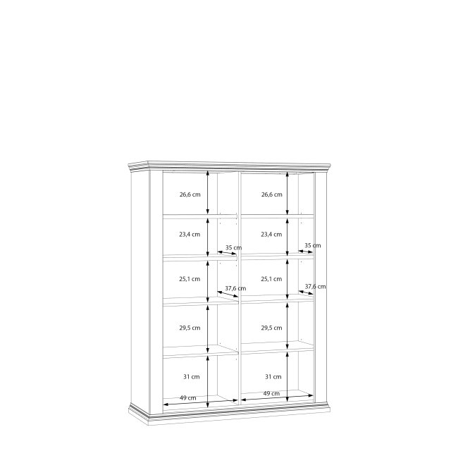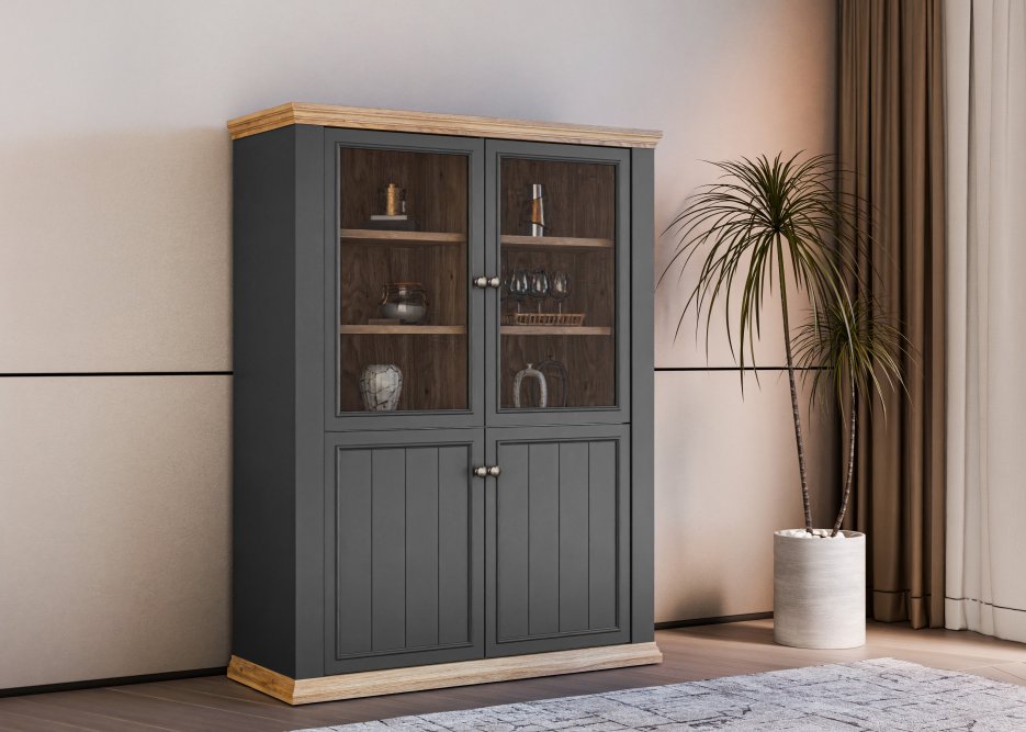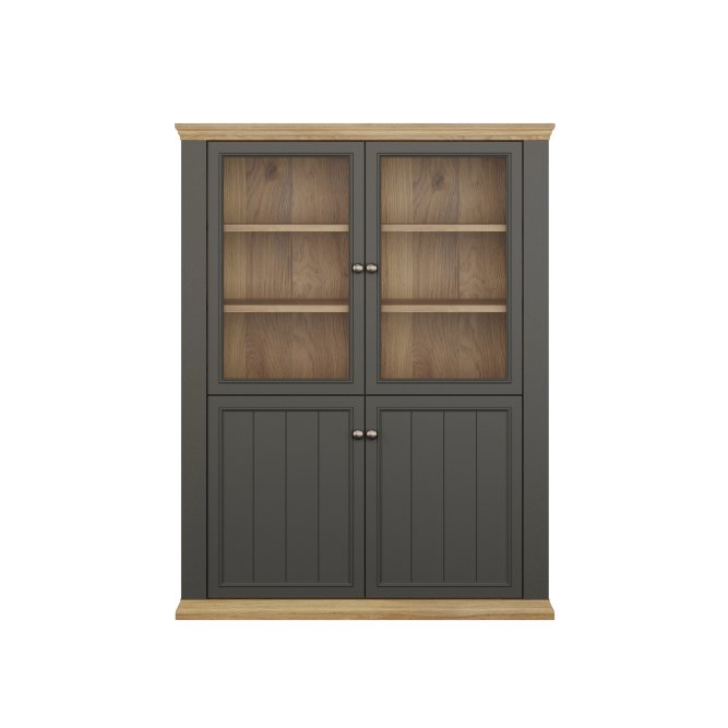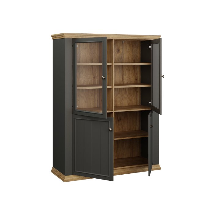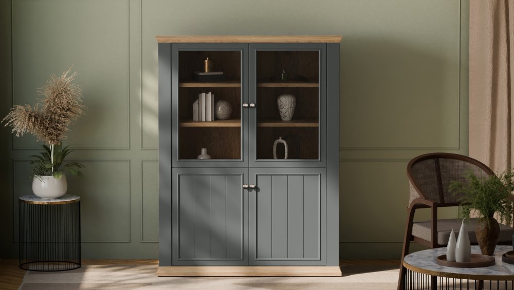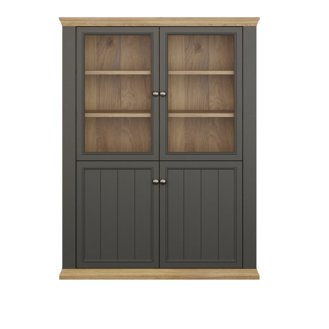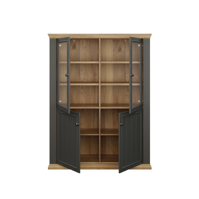 Witryna PONTYPOOL o szerokości niemal 120 cm świetnie wyeksponuje Twoje ulubione książki, pamiątki oraz dekoracje. Pomoże w tym 8 regulowanych półek, z czego 1 półka jest zamontowana na stałe. Mebel wyposażony w transparentne, bezpieczne szkło hartowane. 4-drzwiowa witryna doskonale wygląda zestawiona z pozostałymi elementami z kolekcji, tworząc wymarzoną aranżację salonu.
