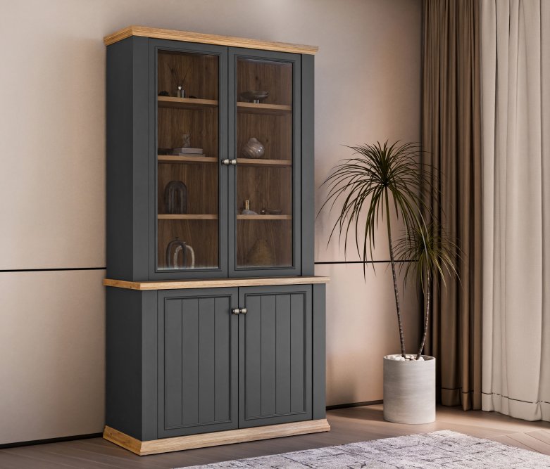 Witryna wykonana w efektownym połączeniu dekorów: Dąb Mauvella / Uni Wolfram Szary