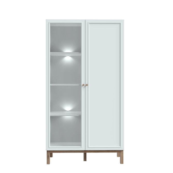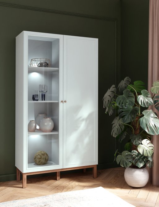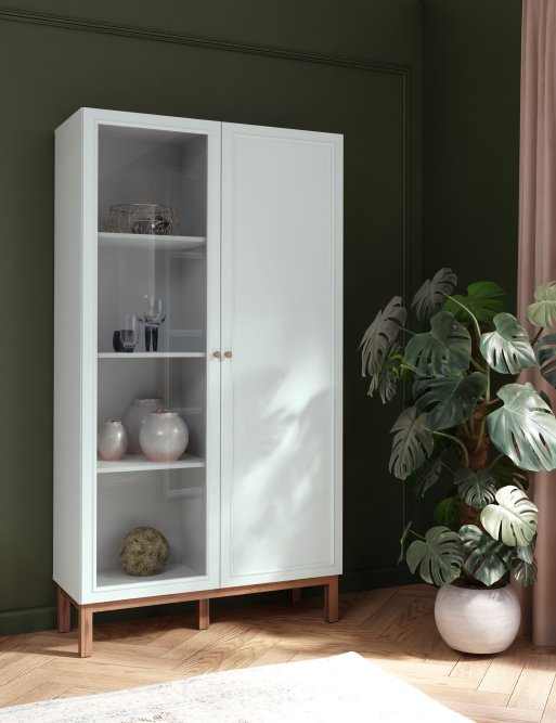 Witryna z kolekcji PENKRIDGE łączy w sobie zalety mebla służącego do ekspozycji oraz funkcjonalność przechowywania. Za lewymi, przeszklonymi drzwiami z transparentnego, bezpiecznego szkła hartowanego ustaw świetnie ulubione zdjęcia, porcelanę, książki, pamiątki z podróży lub dekoracje. Natomiast prawa część mebla pozwoli Ci przechowywać rzeczy za zamkniętymi drzwiami. 2-drzwiowa witryna doskonale wygląda zestawiona z pozostałymi elementami z kolekcji, tworząc wymarzoną aranżację salonu.